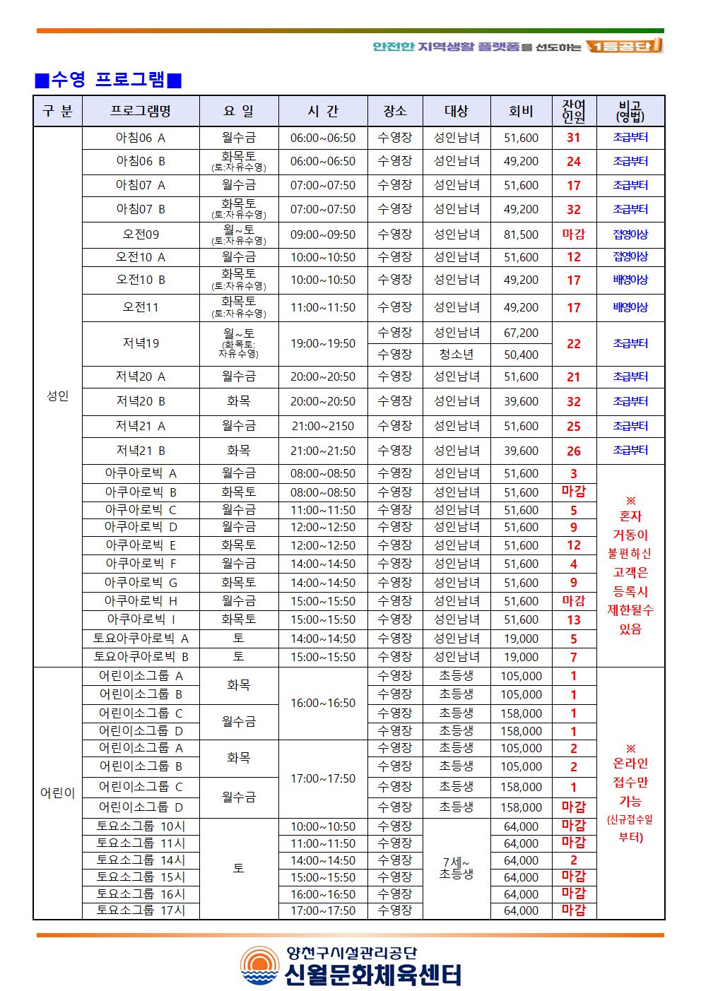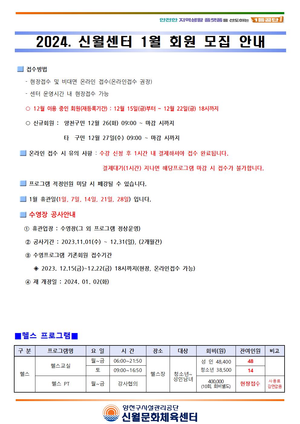 신월문화체육센터 신월문화체육센터 1월 잔여자리 안내 작성자 문모다 등록일자 2023년 12월 22일 16시 10분 11초 조회 943 신월센터 1월 회원 모집안내(2024.1001.jpg [ Size : 146.53KB , Down : 1,098 ] 미리보기 다운로드 신월센터 1월 회원 모집안내(2024.1002.jpg [ Size : 293.34KB , Down : 1,114 ] 미리보기 다운로드 신월센터 1월 회원 모집안내(2024.1003.jpg [ Size : 340.61KB , Down : 1,082 ] 미리보기 다운로드 신월센터 1월 회원 모집안내(2024.1004.jpg [ Size : 190.84KB , Down : 1,041 ] 미리보기 다운로드 목록보기