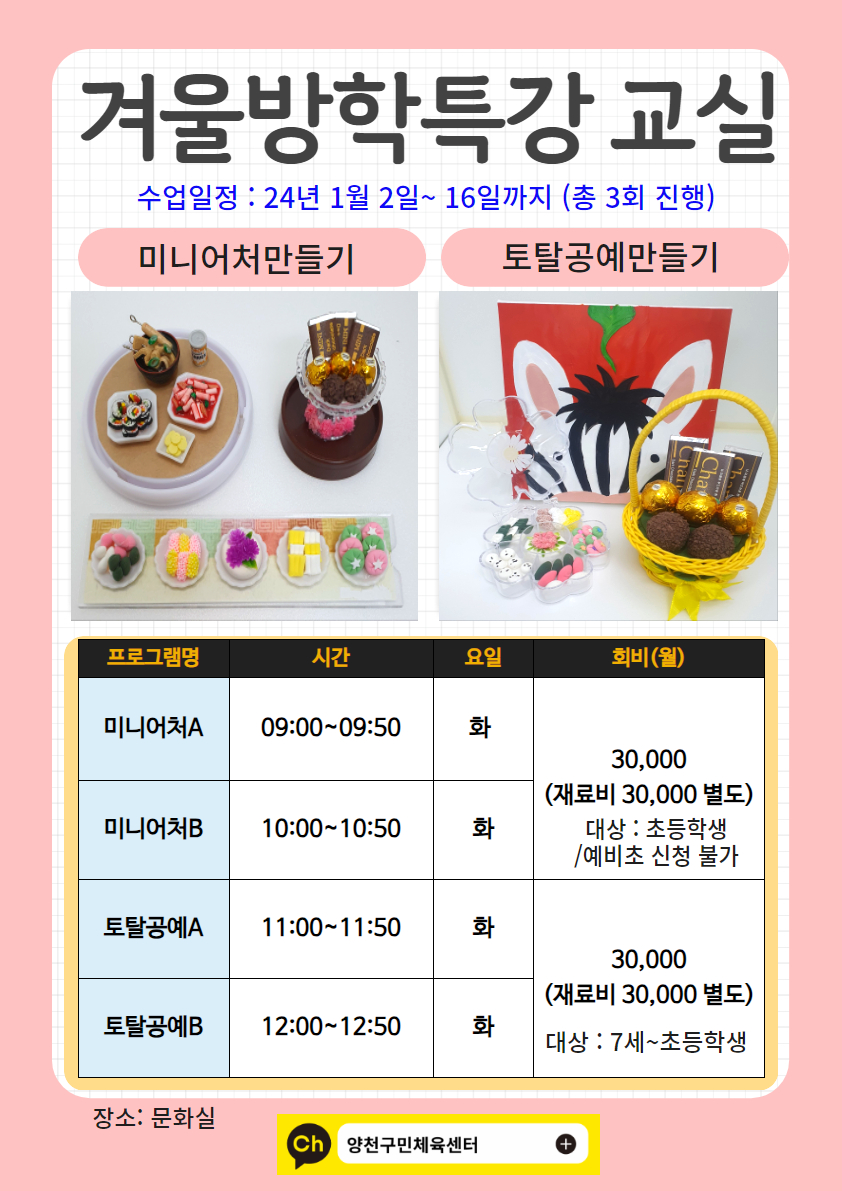 양천구민체육센터 양천구민체육센터 '겨울방학특강' 미니어처, 토탈공예교실 작성자 임명희 등록일자 2023년 12월 7일 11시 9분 11초 조회 471 방특미니어처토탈.jpg [ Size : 644.36KB , Down : 436 ] 미리보기 다운로드 목록보기