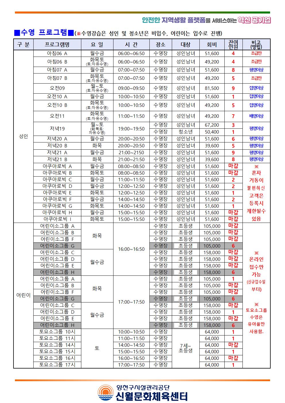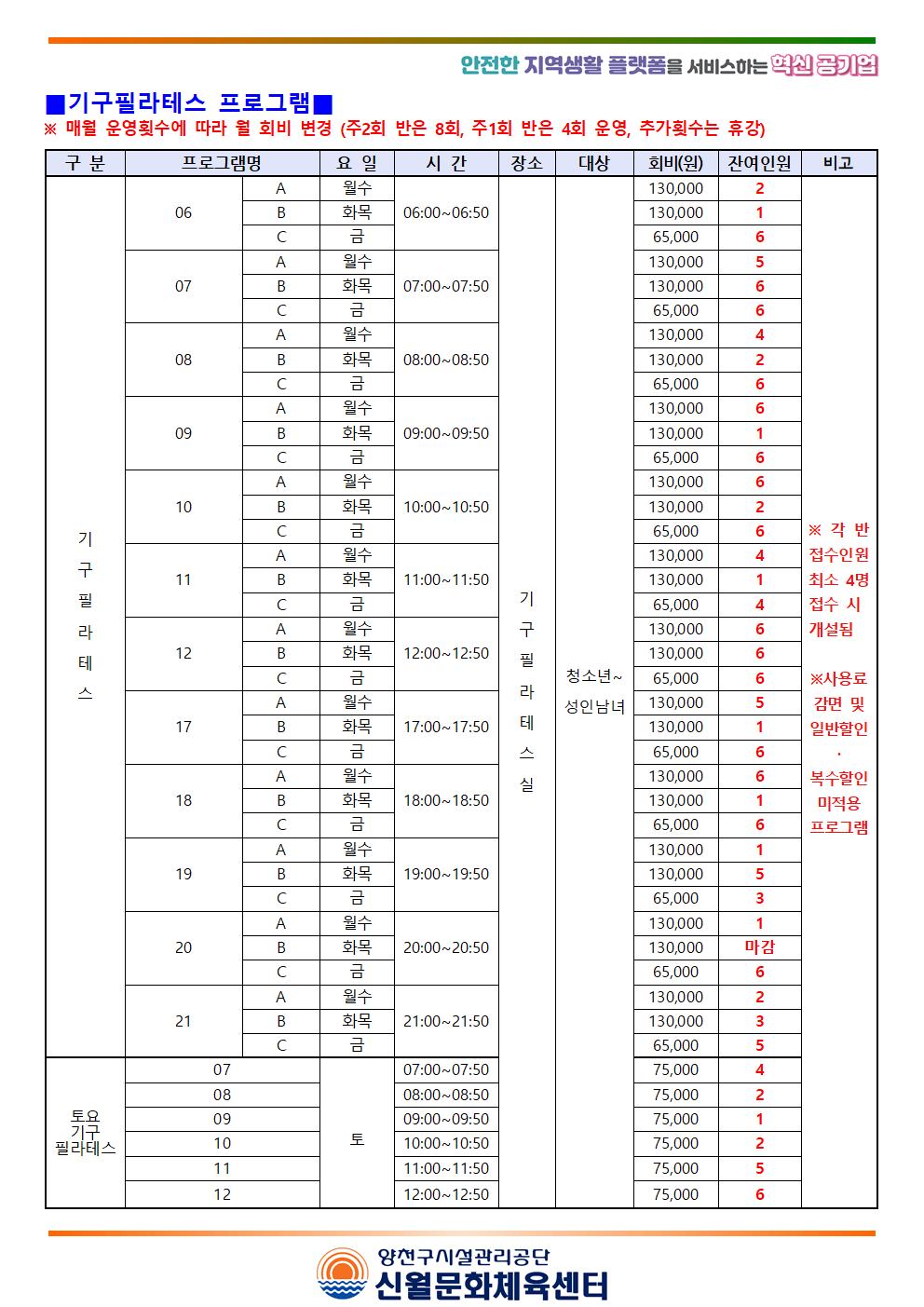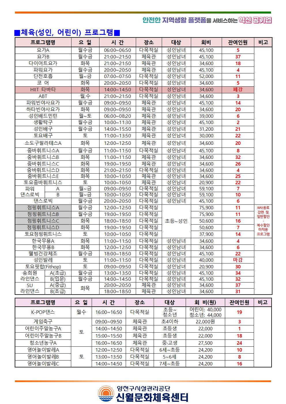 신월문화체육센터 신월문화체육센터 8월 프로그램 마감 및 잔여인원 안내 작성자 신영범 등록일자 2025년 7월 24일 18시 39분 56초 조회 832 신월센터 8월 회원 모집안내(2025.8001.jpg [ Size : 196.7KB , Down : 1,128 ] 미리보기 다운로드 신월센터 8월 회원 모집안내(2025.8002.jpg [ Size : 310.76KB , Down : 1,103 ] 미리보기 다운로드 신월센터 8월 회원 모집안내(2025.8003.jpg [ Size : 332.5KB , Down : 1,063 ] 미리보기 다운로드 신월센터 8월 회원 모집안내(2025.8004.jpg [ Size : 196.72KB , Down : 1,057 ] 미리보기 다운로드 목록보기