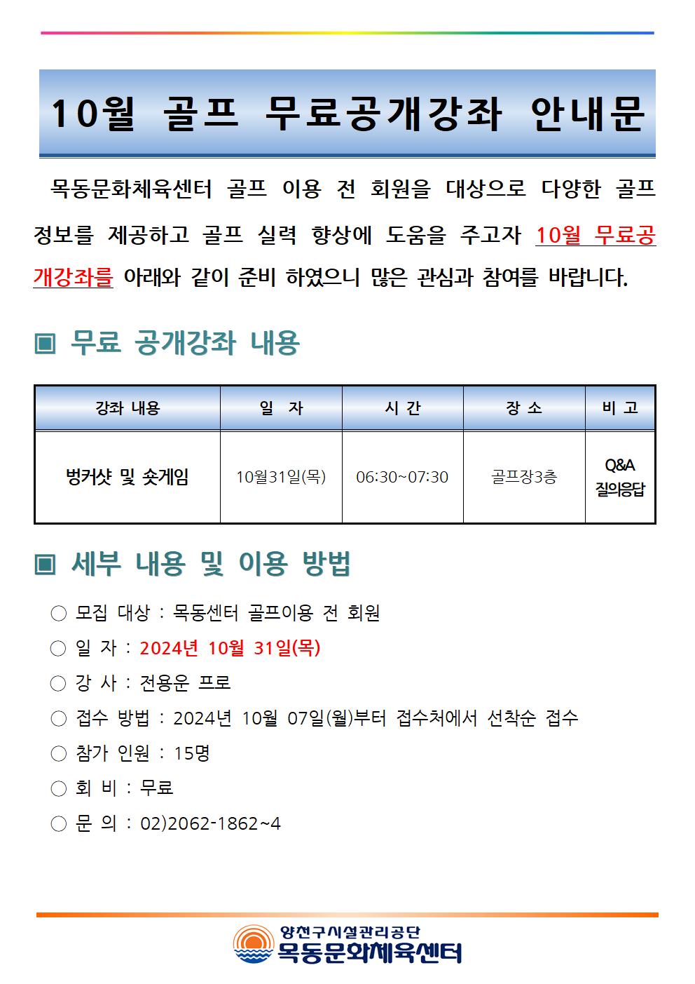 목동문화체육센터 목동문화체육센터 10월 골프 무료공개강좌 안내 작성자 임혜연 등록일자 2024년 10월 7일 10시 48분 41초 조회 268 목동센터 10월 골프 무료 공개강좌 안내문001.jpg [ Size : 143.68KB , Down : 117 ] 미리보기 다운로드 목록보기