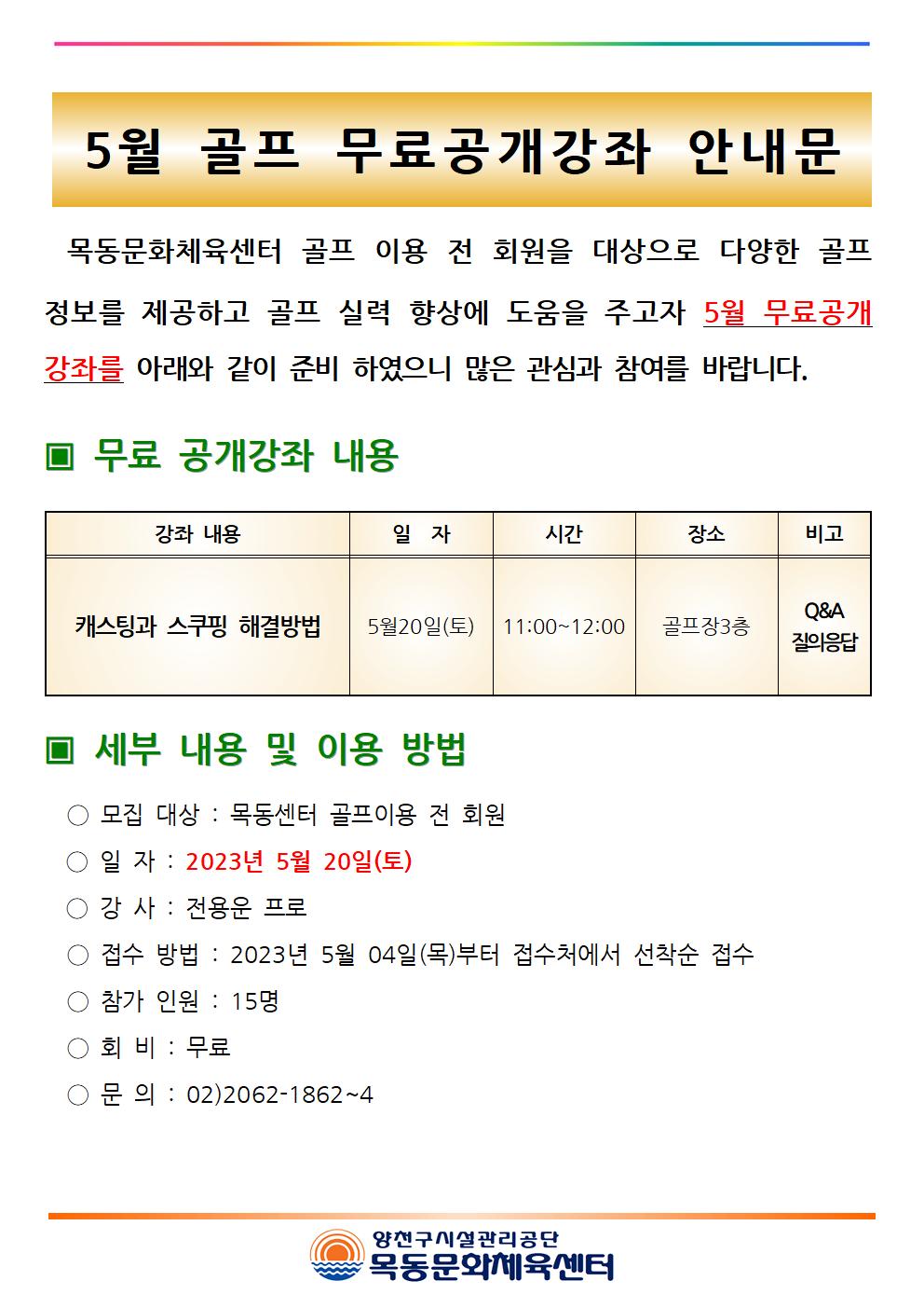 목동문화체육센터 목동문화체육센터 5월 골프 무료공개강좌 안내 작성자 임혜연 등록일자 2023년 5월 4일 9시 10분 11초 조회 467 목동센터 5월 골프 무료 공개강좌 안내문001.jpg [ Size : 143.53KB , Down : 356 ] 미리보기 다운로드 목록보기