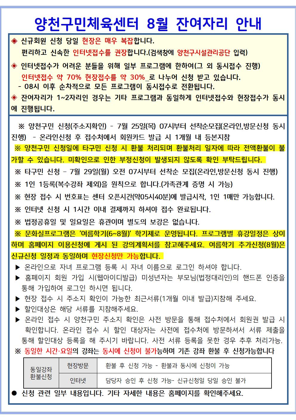 양천구민체육센터 양천구민체육센터 8월 운영프로그램 잔여자리 안내