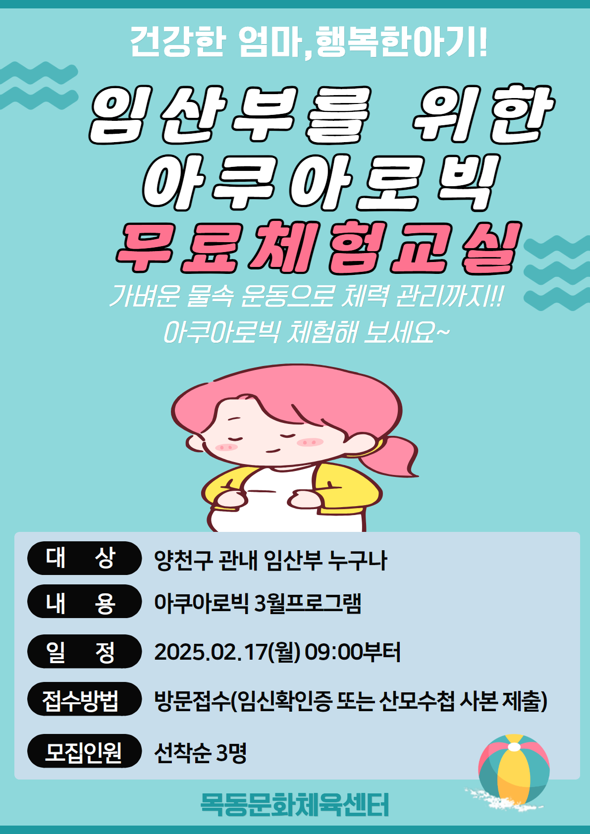 목동문화체육센터 목동문화체육센터 3월 임산부 아쿠아로빅 무료체험 안내 작성자 강주연 등록일자 2025년 2월 4일 17시 24분 4초 조회 257 무료체험 안내문.jpg [ Size : 830.43KB , Down : 209 ] 미리보기 다운로드 목록보기