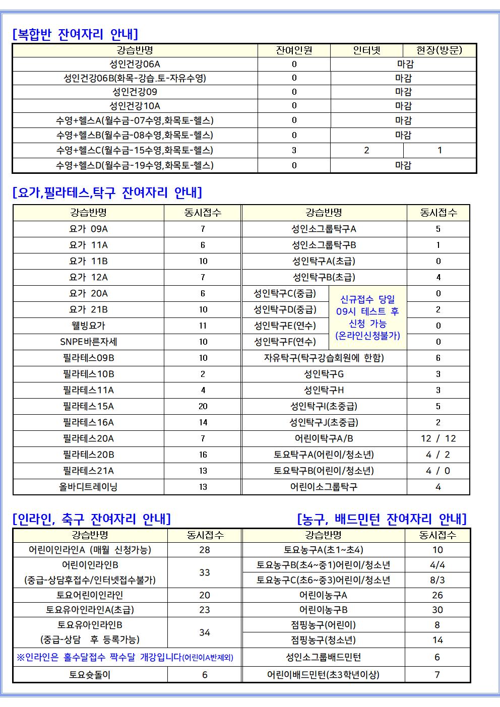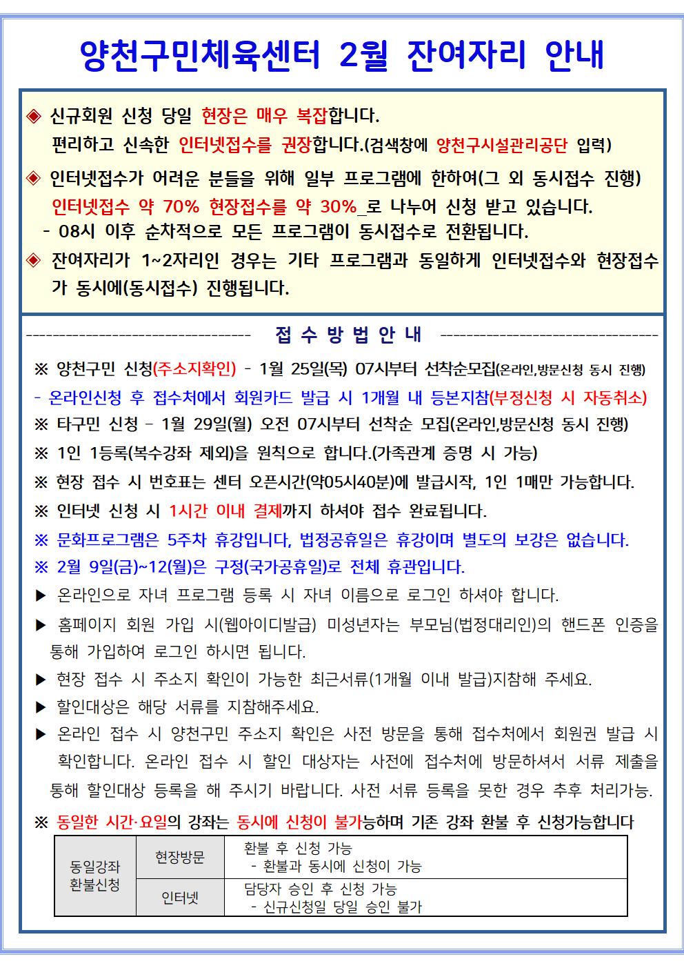 양천구민체육센터 양천구민체육센터 2월 운영프로그램 잔여