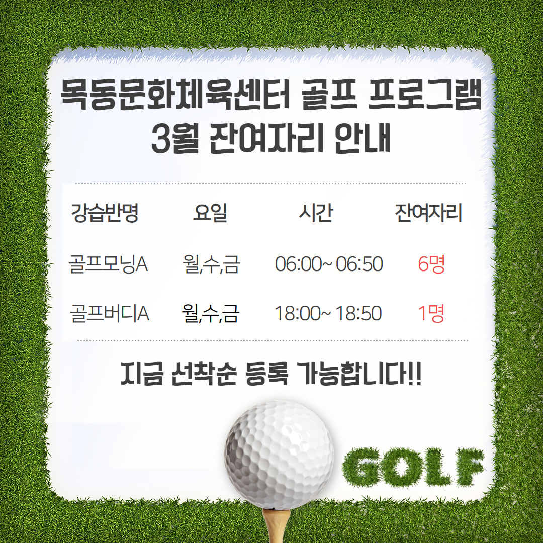 목동문화체육센터 목동문화체육센터 골프 프로그램 3월 잔여자리 안내 작성자 임혜연 등록일자 2025년 2월 27일 12시 38분 43초 조회 264 3월잔여.jpg [ Size : 1.16MB , Down : 123 ] 미리보기 다운로드 목록보기