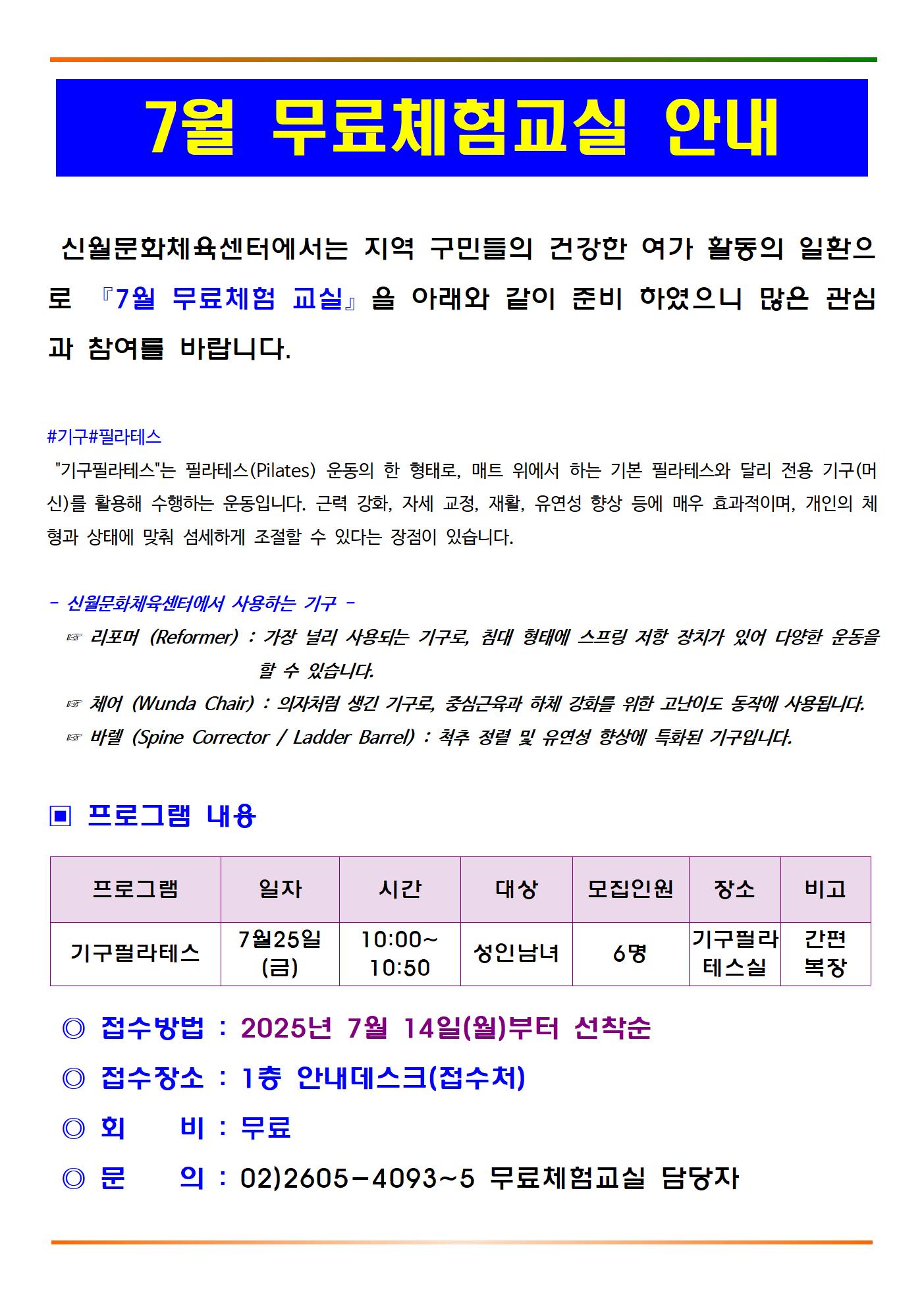 신월문화체육센터 신월문화체육센터 7월 무료체험교실(기구필라테스) 운영 안내 작성자 신영범 등록일자 2025년 7월 10일 13시 19분 31초 조회 336 7월 무료체험교실 안내문(기구필라테스)001.jpg [ Size : 282.54KB , Down : 258 ] 미리보기 다운로드 목록보기