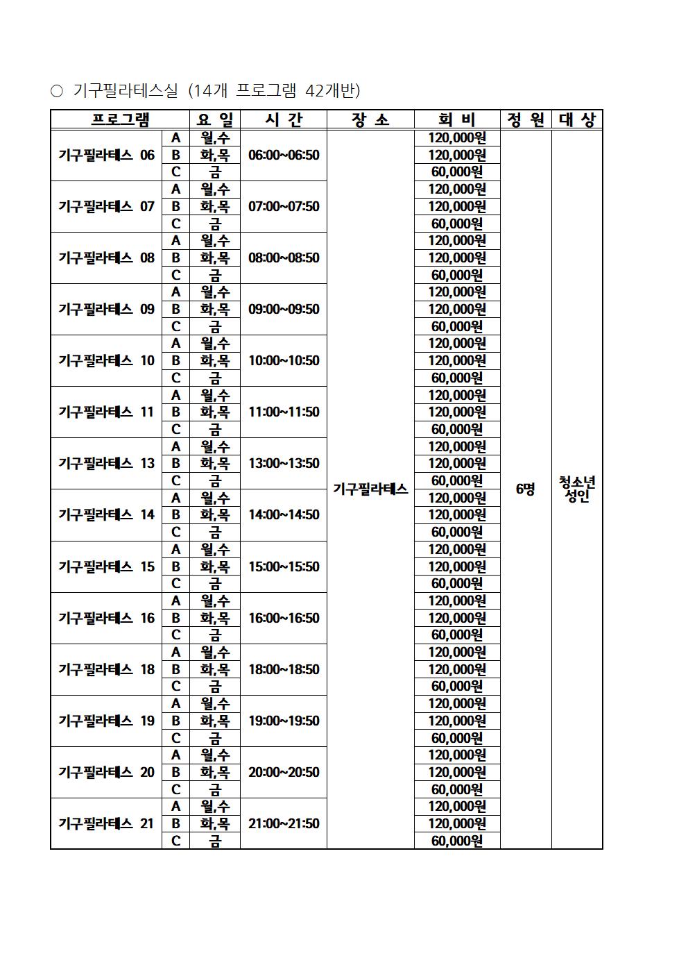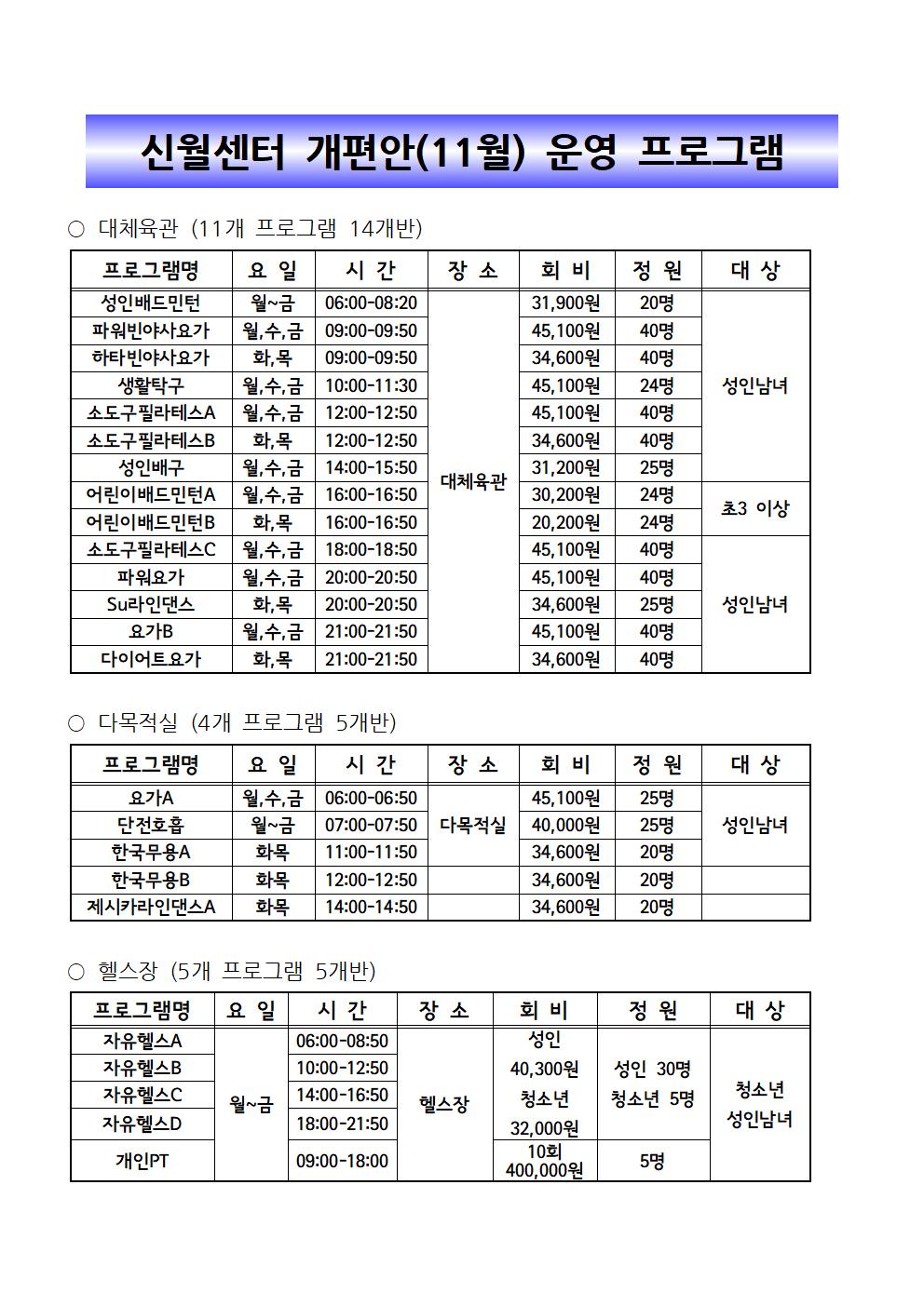 신월문화체육센터 신월문화체육센터 11월 프로그램 모집안내 작성자 등록일자 2021년 10월 19일 13시 14분 31초 조회 2,354 개편안(11월) 프로그램 현황001.jpg [ Size : 220.25KB , Down : 121 ] 미리보기 다운로드 개편안(11월) 프로그램 현황002.jpg [ Size : 181.91KB , Down : 111 ] 미리보기 다운로드 목록보기