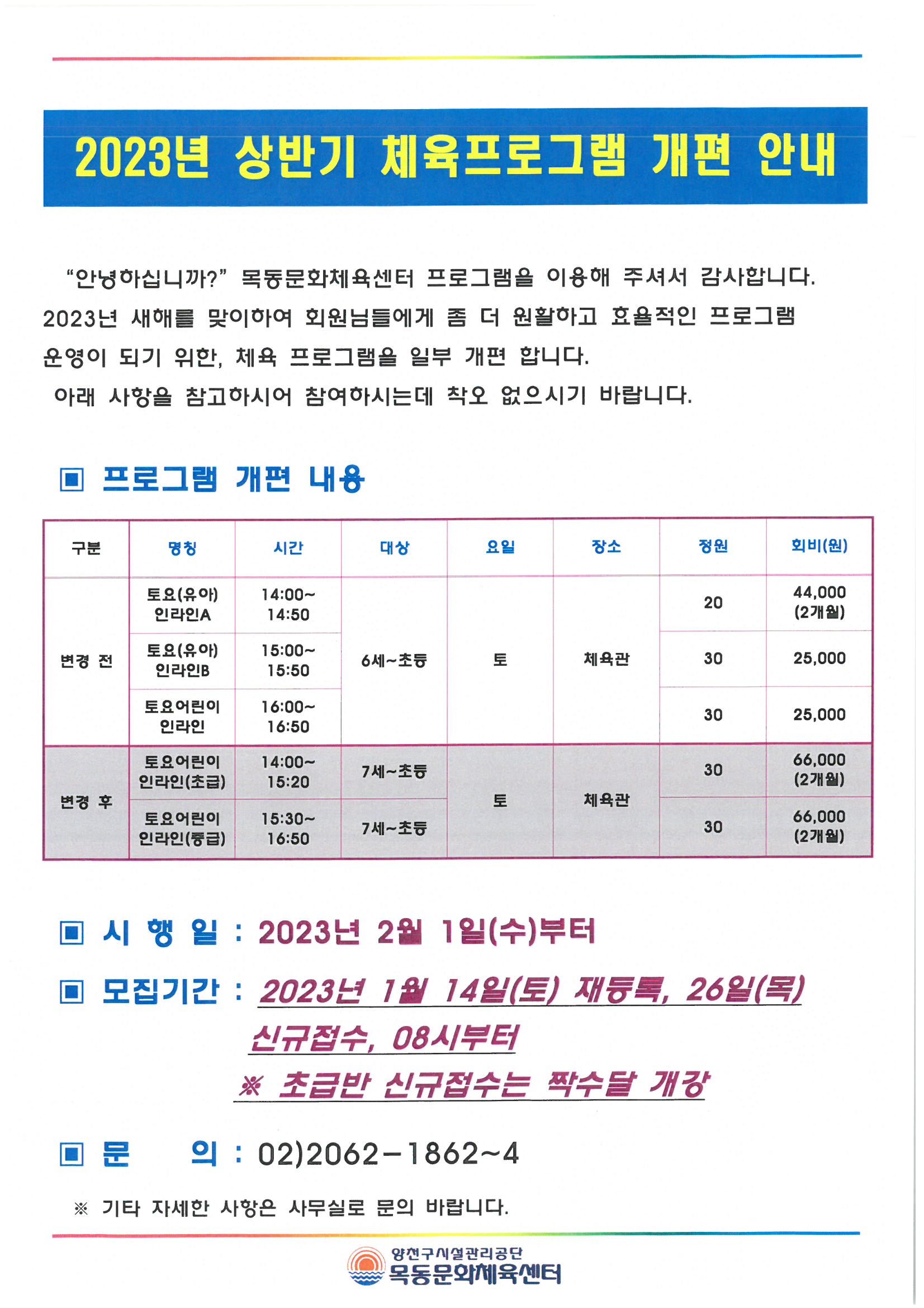 목동문화체육센터 목동문화체육센터 2023년도 상반기 체육관 프로그램(토요인라인) 개편 안내 작성자 관리자 등록일자 2023년 1월 4일 9시 32분 40초 조회 502 토요인라인 개편 안내지 스캔.jpg [ Size : 368.95KB , Down : 387 ] 미리보기 다운로드 목록보기
