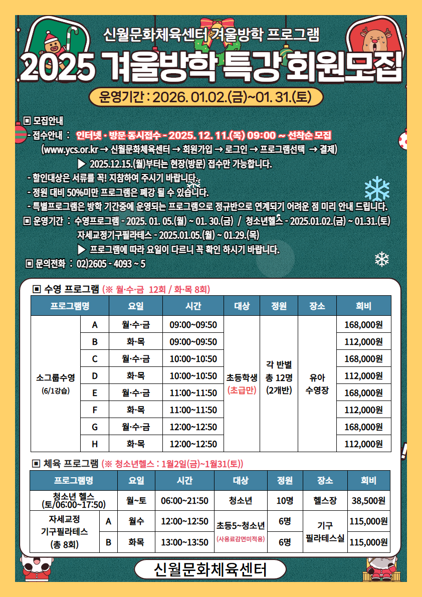 신월문화체육센터 신월센터 겨울방학 특별프로그램 회원모집 안내 작성자 손미선 등록일자 2025년 11월 28일 8시 30분 47초 조회 85 25년 겨울방학특강(안내지).png [ Size : 434.55KB , Down : 114 ] 미리보기 다운로드 목록보기