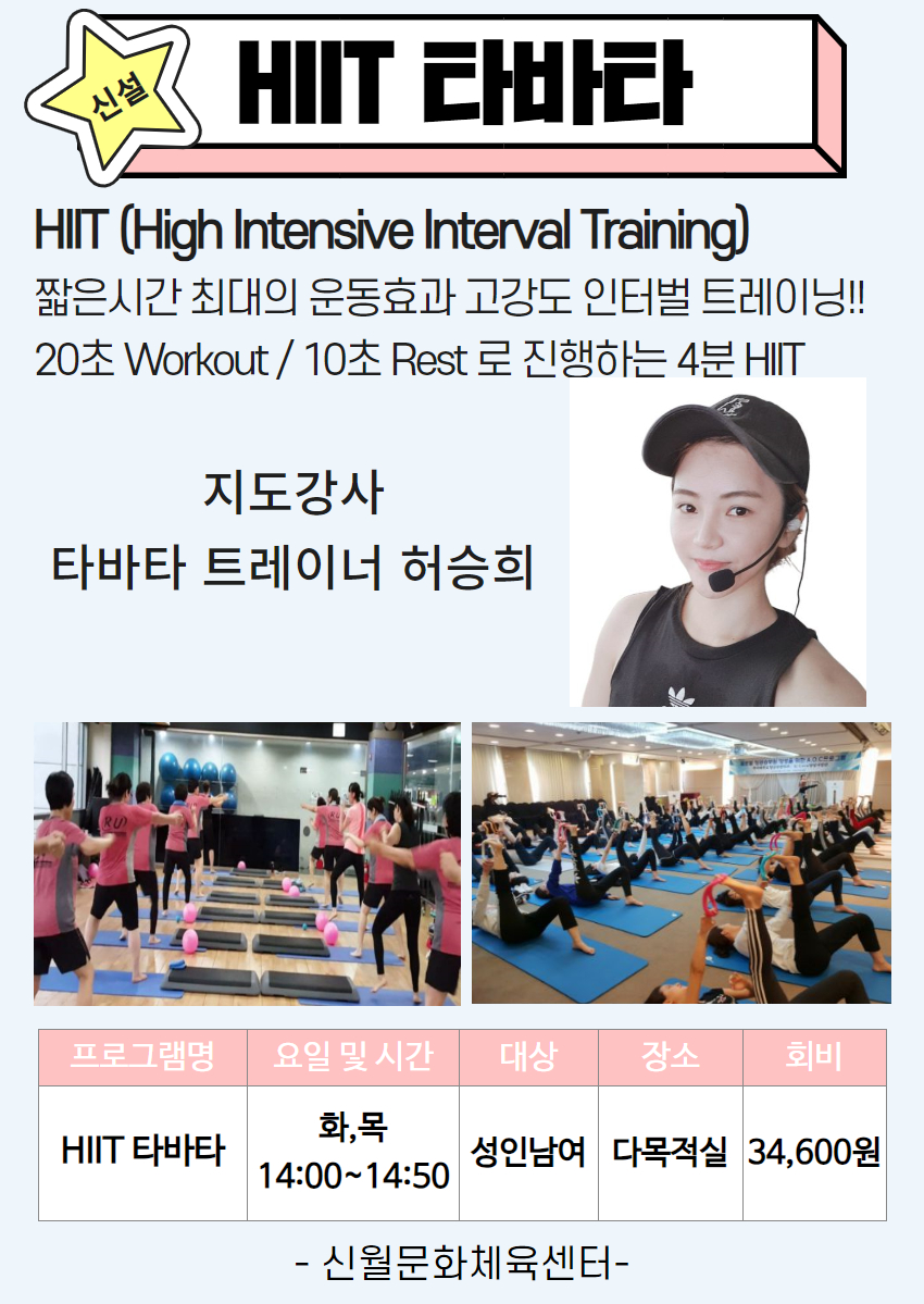 신월문화체육센터 신월문화체육센터 < HIIT 타바타> 프로그램 신설 안내 작성자 문모다 등록일자 2024년 6월 25일 14시 16분 27초 조회 614 타바타.jpg [ Size : 666.49KB , Down : 484 ] 미리보기 다운로드 목록보기