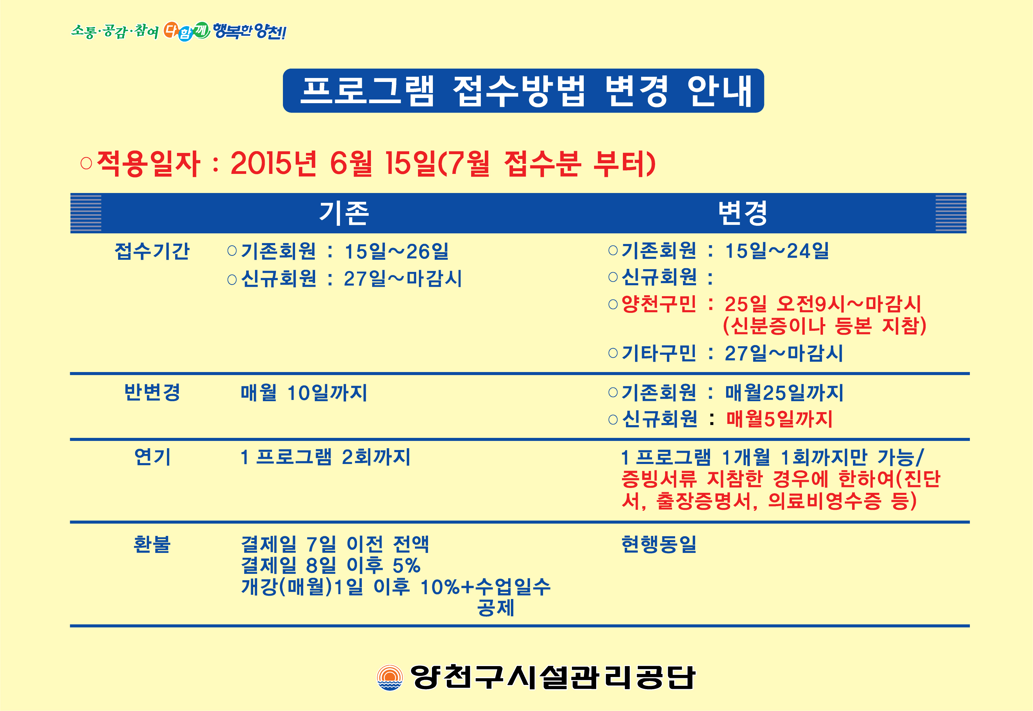 <P style="TEXT-ALIGN: left; MARGIN-TOP: 0pt; unicode-bidi: embed; DIRECTION: ltr; MARGIN-BOTTOM: 0pt; MARGIN-LEFT: 0.5in; language: ko; mso-line-break-override: none; punctuation-wrap: hanging"><SPAN style="FONT-FAMILY: \'맑은 고딕\'; COLOR: black; FONT-SIZE: 18pt; language: ko; mso-ascii-font-family: \'맑은 고딕\'; mso-fareast-font-family: \'맑은 고딕\'; mso-bidi-font-family: +mn-cs; mso-color-index: 1; mso-font-kerning: 12.0pt">양천구민체육센터 프로그램 접수방법이 변경되었습니다.</SPAN></P>