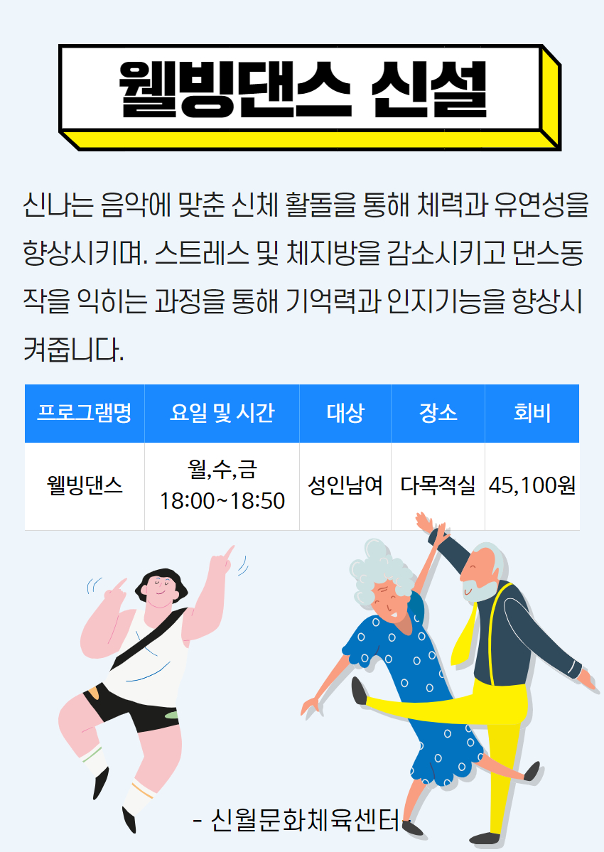 신월문화체육센터 신월문화체육센터 <웰빙댄스> 신설안내 작성자 문모다 등록일자 2023년 12월 18일 9시 40분 36초 조회 388 웰빙.jpg [ Size : 493.98KB , Down : 221 ] 미리보기 다운로드 목록보기