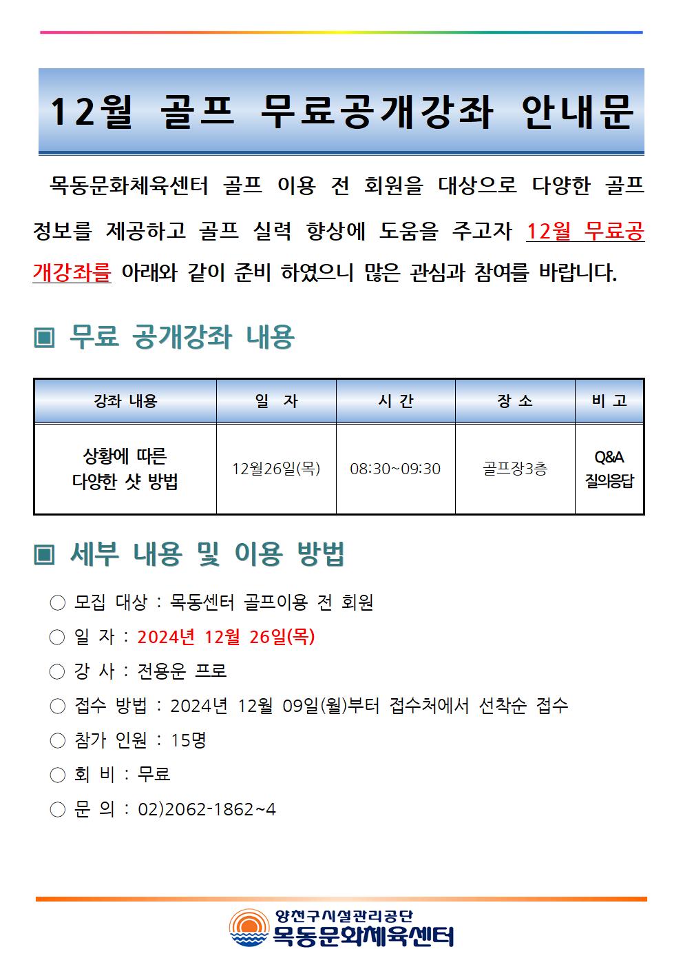 목동문화체육센터 목동문화체육센터 12월 골프 무료공개강좌 안내 작성자 임혜연 등록일자 2024년 12월 9일 10시 5분 56초 조회 333 12월 골프 무료 공개강좌 안내문 (2)001.jpg [ Size : 145.07KB , Down : 106 ] 미리보기 다운로드 목록보기