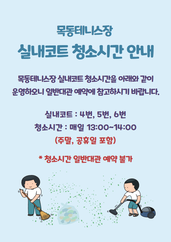 목동테니스장 실내코트 청소시간 안내 작성자 윤성철 등록일자 2025년 4월 24일 9시 42분 20초 조회 308 실내코트 청소시간 안내.jpg [ Size : 277.81KB , Down : 310 ] 미리보기 다운로드 목록보기