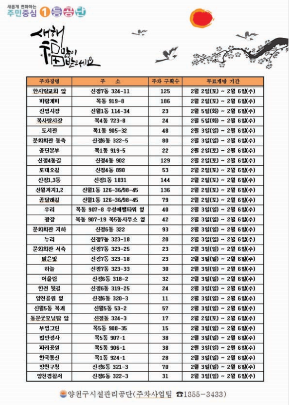 설 명절 공영주차장 무료개방 안내(주차장별 무료기간 확인 필수) 작성자 등록일자 2019년 1월 30일 9시 27분 43초 조회 946 양천구시설관리공단에서는 설 연휴를 맞아 공영주차장을 무료로 개방합니다.주차장마다 무료주차 기간이 다르오니 꼭 확인하시고 이용해주시기 바랍니다.2019년 기해년 새해 복 많이 받으십시요~ 설연휴 무료주차.png [ Size : 529.87KB , Down : 116 ] 미리보기 다운로드 목록보기