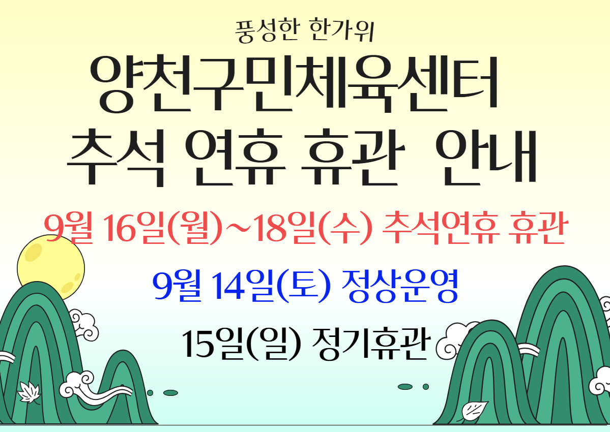 양천구민체육센터 추석연휴 휴관 안내 작성자 임명희 등록일자 2024년 9월 11일 16시 56분 12초 조회 558 추석휴관 .jpg [ Size : 524.86KB , Down : 529 ] 미리보기 다운로드 목록보기