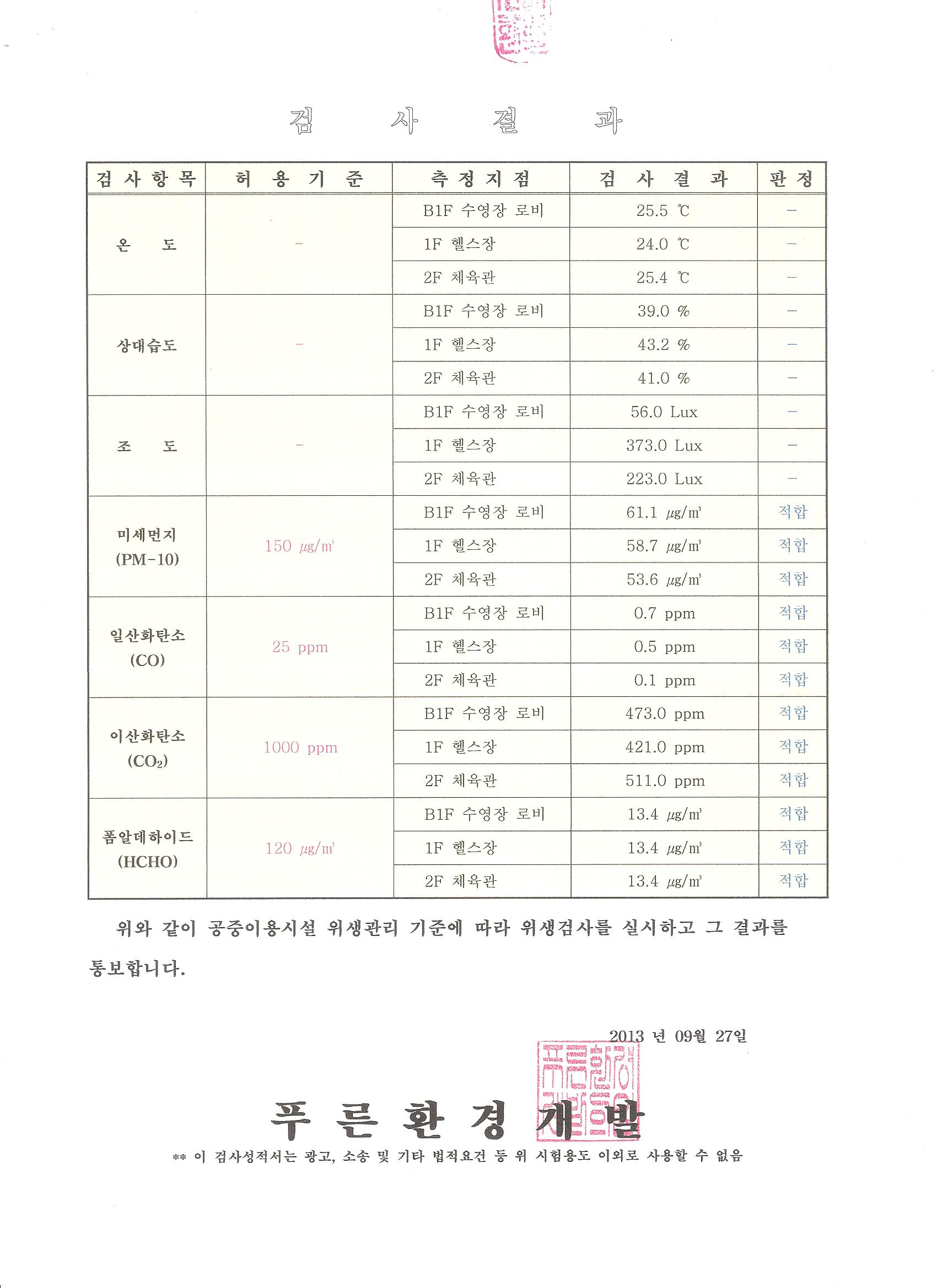 목동문화체육센터 실내공기질검사 결과 공지 작성자 등록일자 2013년 10월 21일 9시 42분 35초 조회 1,488 목동문화체육센터 실내공기질검사 결과를 아래와 같이 공지합니다.검사일자 : 2013.09.17검사항목 : 미세먼지, 일산화탄소, 이산화탄소, 폼알데하이드검사결과 : 적합 검사결과.jpg [ Size : 287.59KB , Down : 126 ] 미리보기 다운로드 목록보기