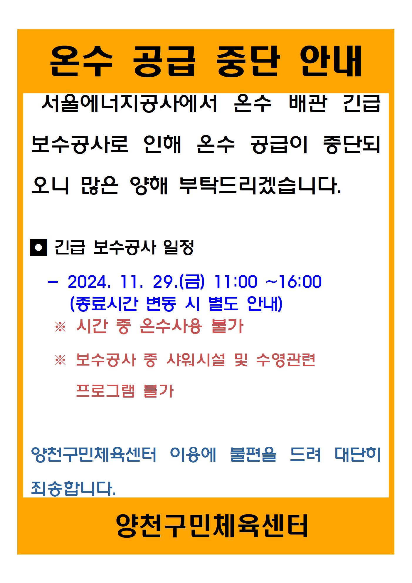 긴급)양천구민체육센터 온수공급 일시 중단 안내 작성자 임명희 등록일자 2024년 11월 29일 11시 13분 47초 조회 241 온수중단안내문001.jpg [ Size : 228.88KB , Down : 235 ] 미리보기 다운로드 목록보기