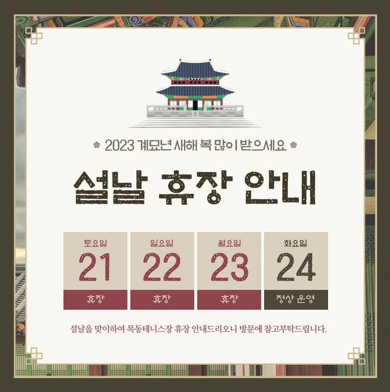 목동테니스장 설 연휴기간 휴장 안내 작성자 관리자 등록일자 2023년 1월 11일 14시 38분 42초 조회 560 설날휴장.jpeg [ Size : 104.97KB , Down : 530 ] 미리보기 다운로드 목록보기