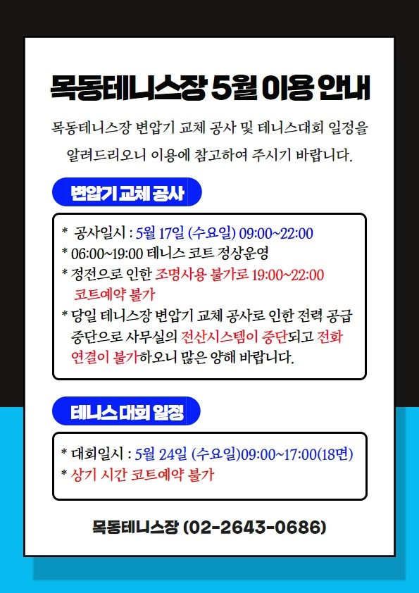 목동테니스장 5월 이용안내 작성자 윤성철 등록일자 2023년 5월 8일 8시 36분 8초 조회 506 테니스장이용안내.jpg [ Size : 144.15KB , Down : 615 ] 미리보기 다운로드 목록보기