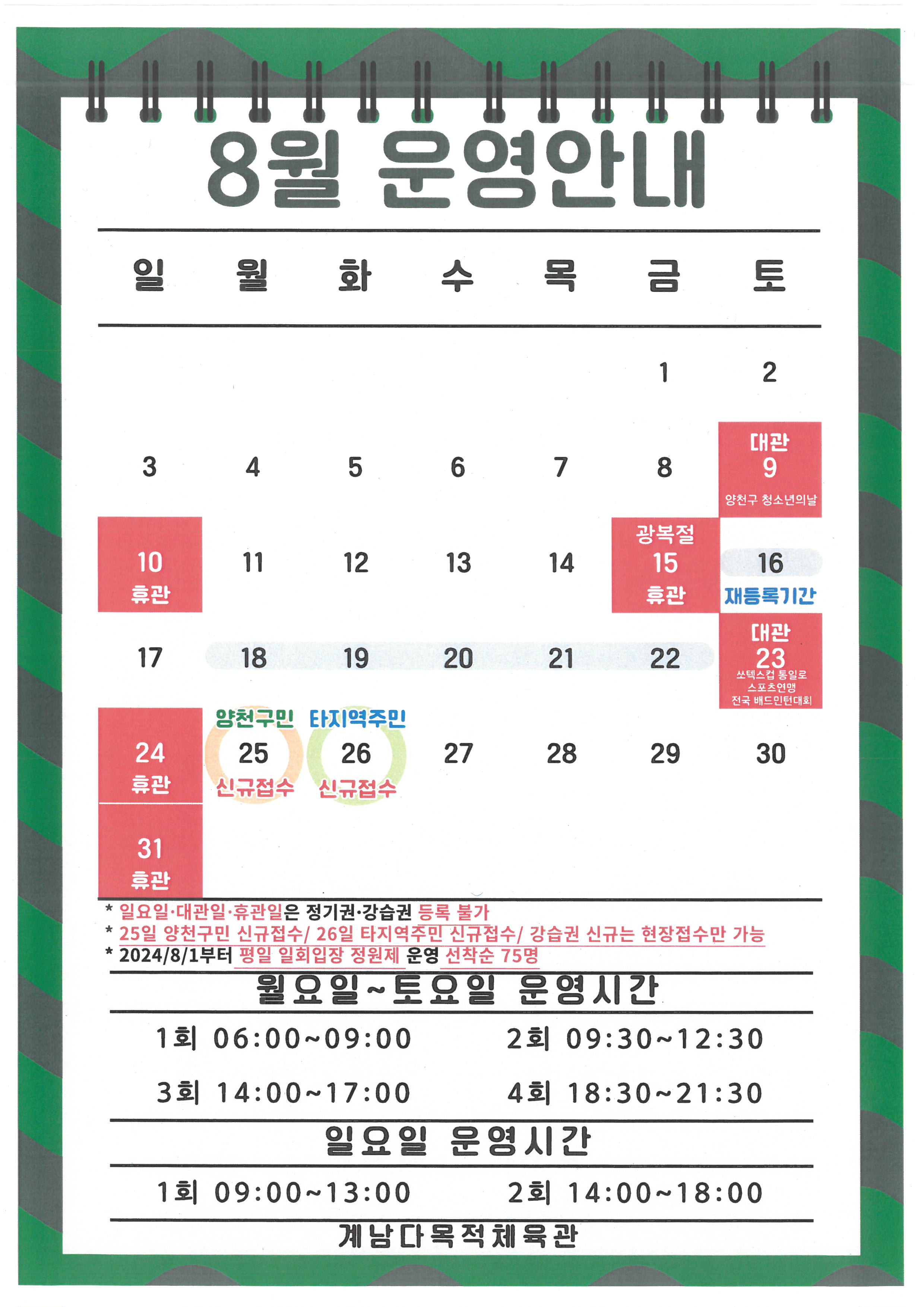 계남다목적체육관 8월 이용안내 작성자 곽재신 등록일자 2025년 7월 11일 10시 42분 32초 조회 455 8월 이용안내.jpg [ Size : 675.92KB , Down : 140 ] 미리보기 다운로드 목록보기