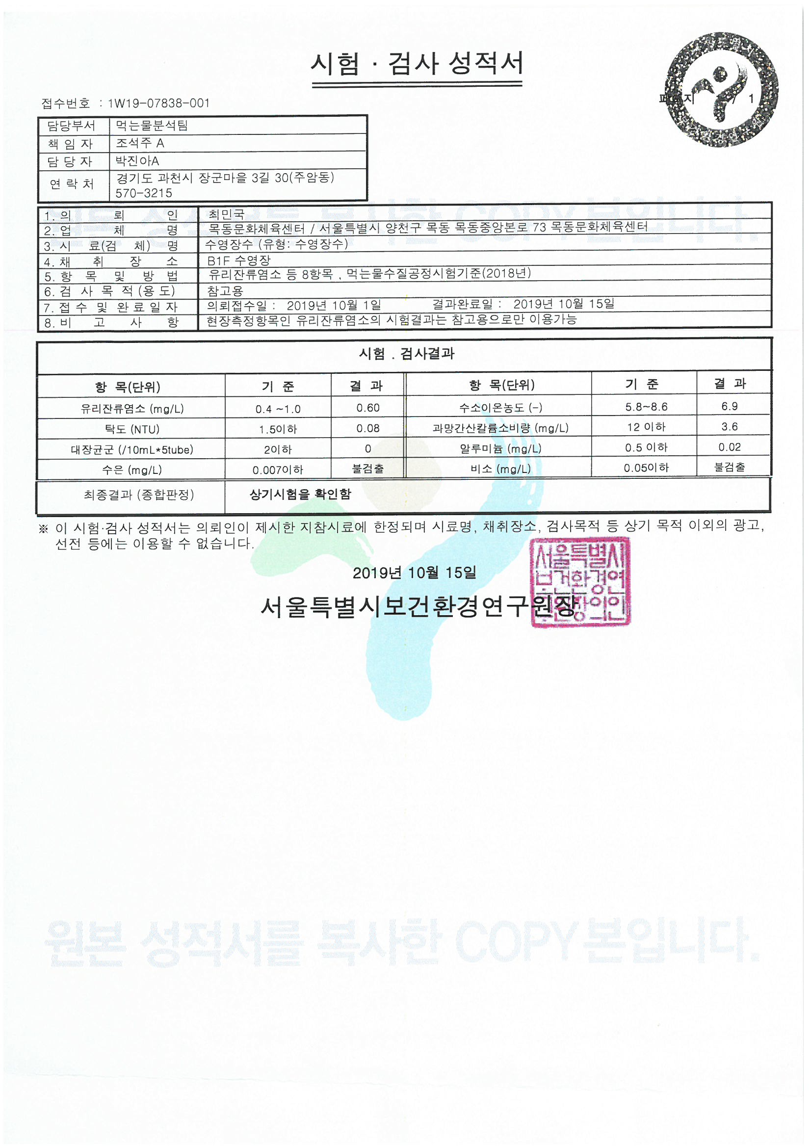 목동문화체육센터 2019년 10월 수영장 수질 검사 결과 안내