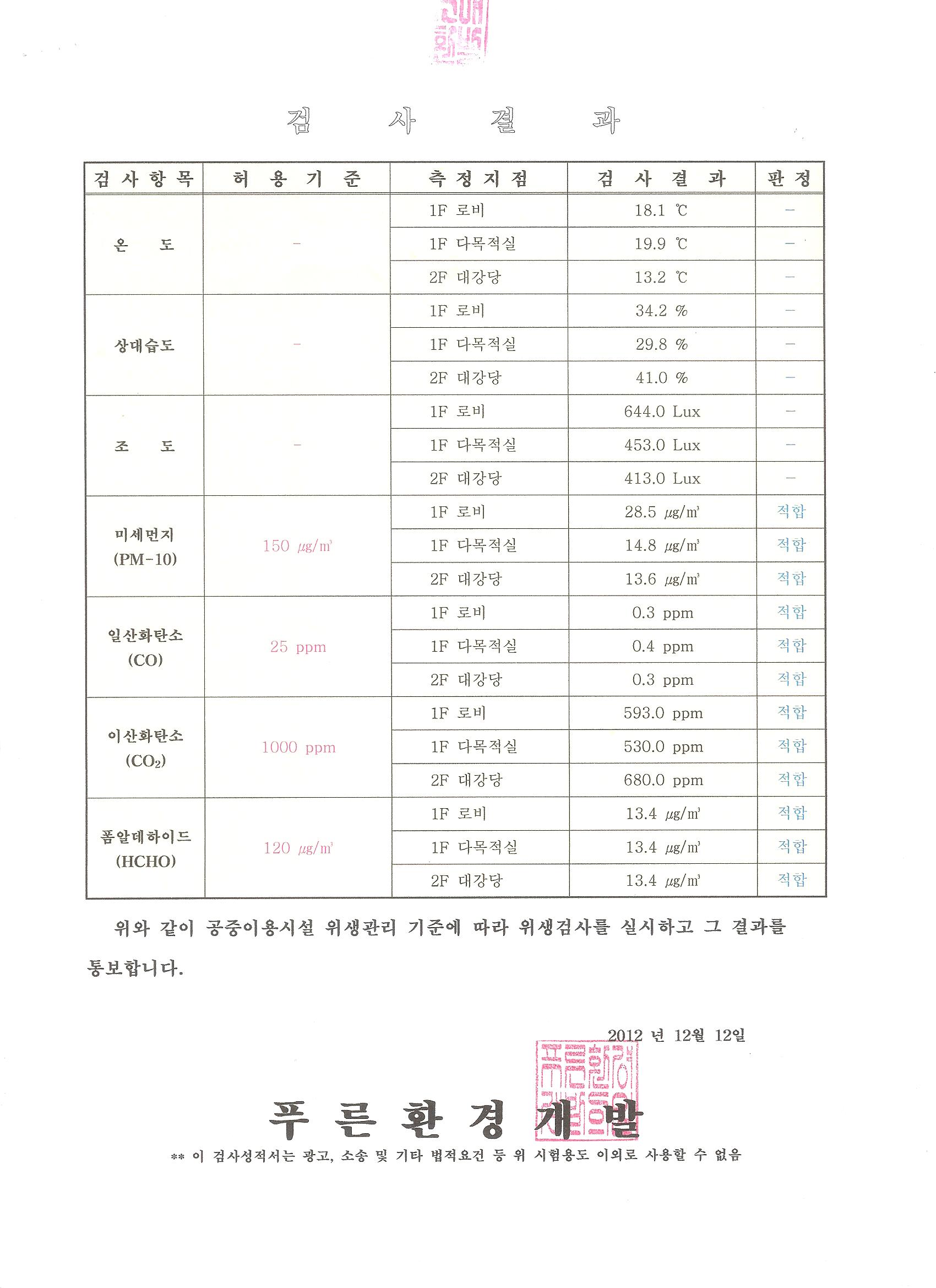 목동문화체육센터 실내공기질 검사결과 공지 작성자 등록일자 2012년 12월 10일 11시 29분 19초 조회 1,680 목동문화체육센터 4분기 실내공기질검사 결과를 붙임과 같이 공지합니다. 검사기관 : 푸른환경개발 검사항목 : 미세먼지, 일산화탄소, 이산화탄소, 폼알데하이드 검사결과 : 적합(붙임 "검사결과" 참조) 실내공기질검사 결과.jpg [ Size : 277.1KB , Down : 116 ] 미리보기 다운로드 목록보기