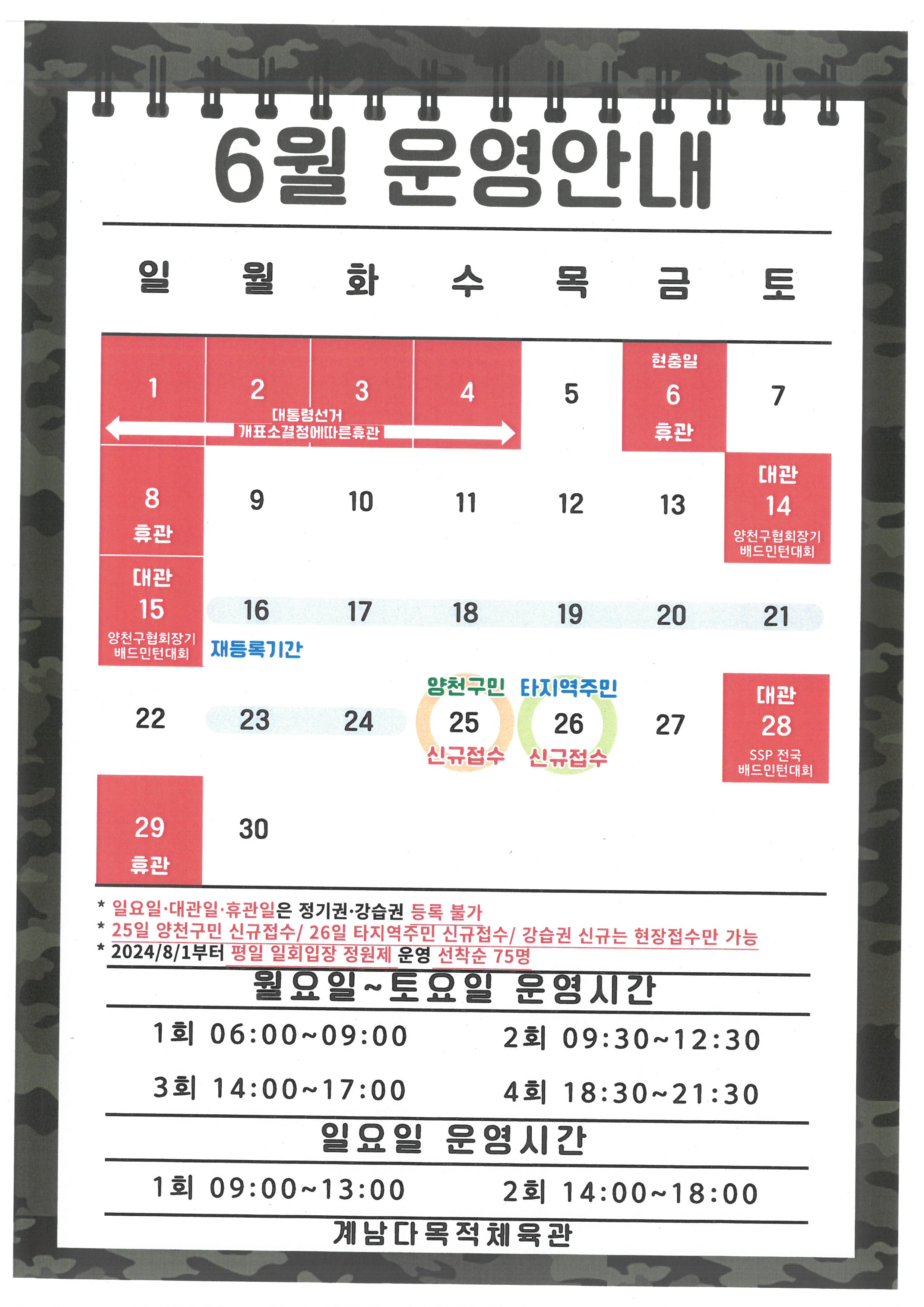 계남다목적체육관 6월 이용안내 작성자 곽재신 등록일자 2025년 5월 23일 17시 5분 14초 조회 423 6월 이용안내.jpg [ Size : 689.17KB , Down : 162 ] 미리보기 다운로드 목록보기