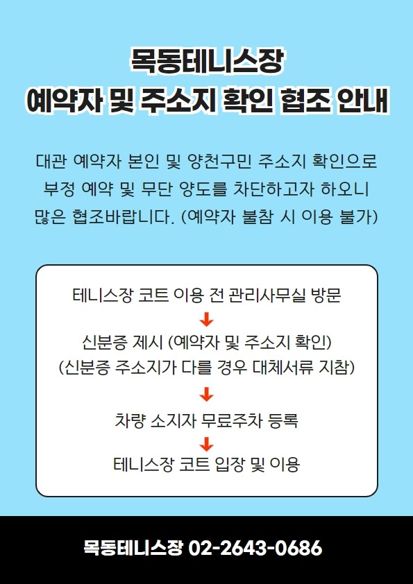 목동테니스장 예약자 주소지 확인 협조 안내 작성자 윤성철 등록일자 2023년 5월 9일 17시 46분 39초 조회 664 테니스장.jpg [ Size : 121.19KB , Down : 807 ] 미리보기 다운로드 목록보기