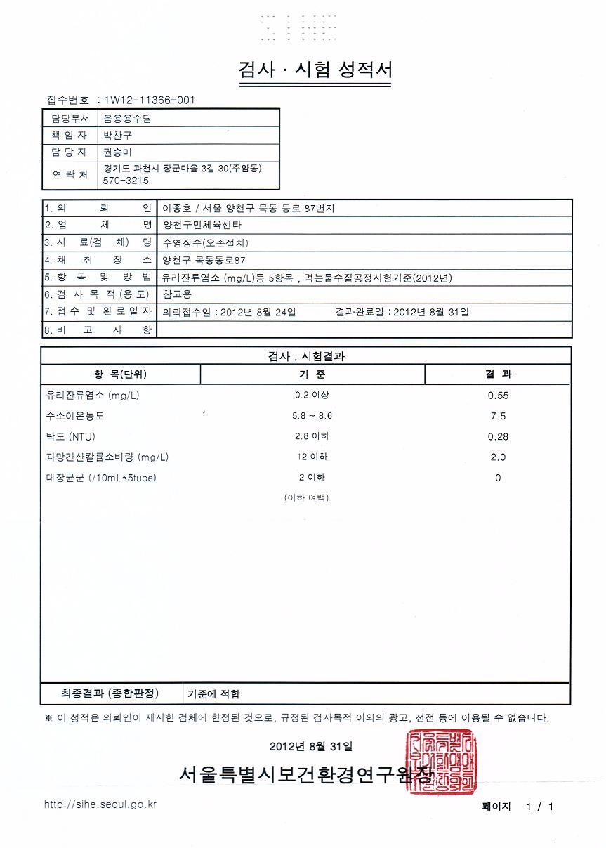 양천구민체육센터 수질검사 결과를 아래와 같이 공지합니다.