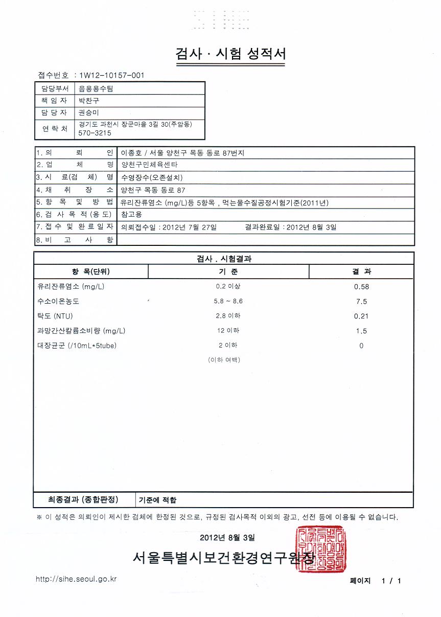 양천구민체육센터 수질검사 결과를 아래와 같이 공지합니다.
