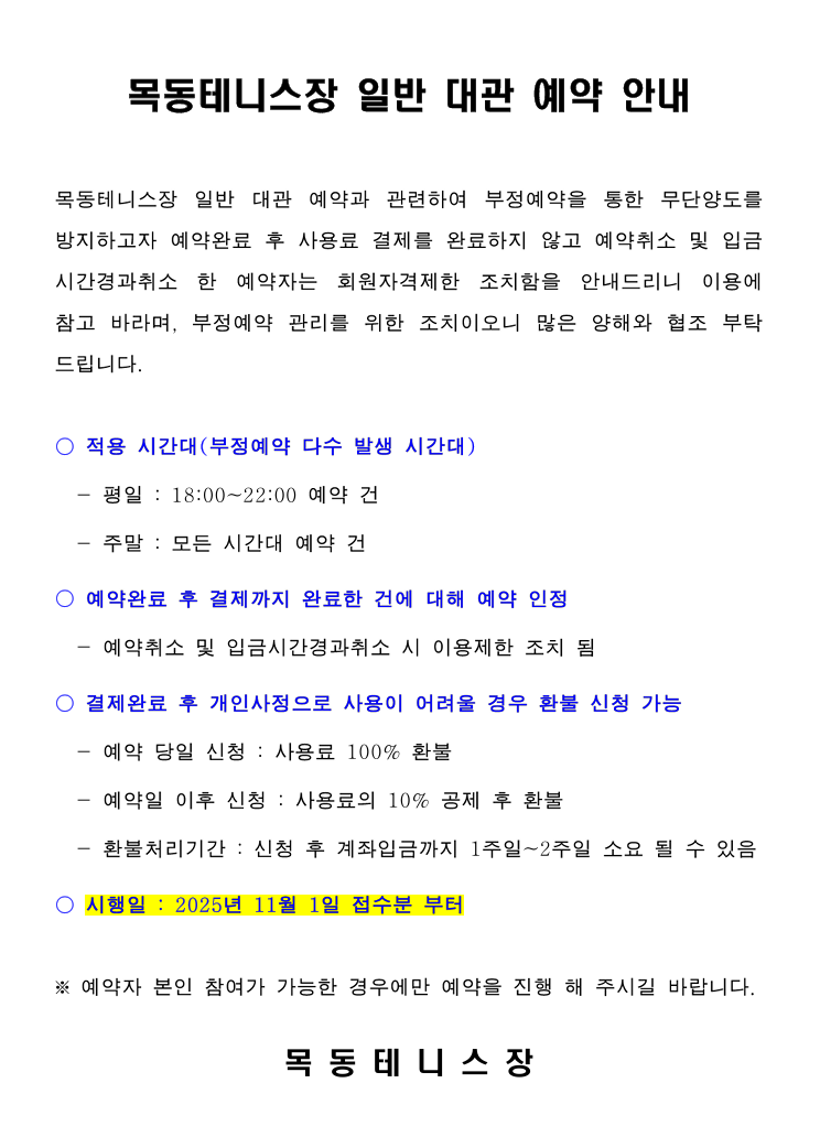 공지 목동테니스장 일반 대관 예약 안내 작성자 윤성철 등록일자 2025년 10월 30일 14시 46분 3초 조회 17 코트 대관 예약 안내.png [ Size : 116.01KB , Down : 19 ] 미리보기 다운로드 목록보기