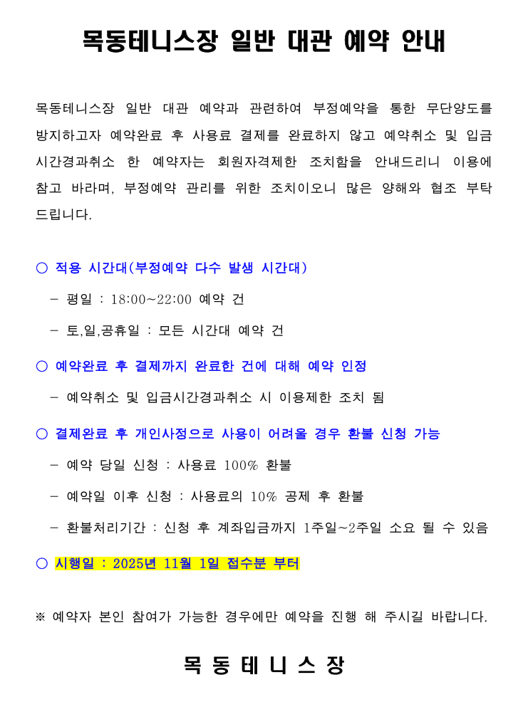 공지 목동테니스장 일반 대관 예약 안내 작성자 윤성철 등록일자 2025년 10월 30일 14시 46분 3초 조회 93 코트 대관 예약 안내.png [ Size : 91.81KB , Down : 34 ] 미리보기 다운로드 목록보기