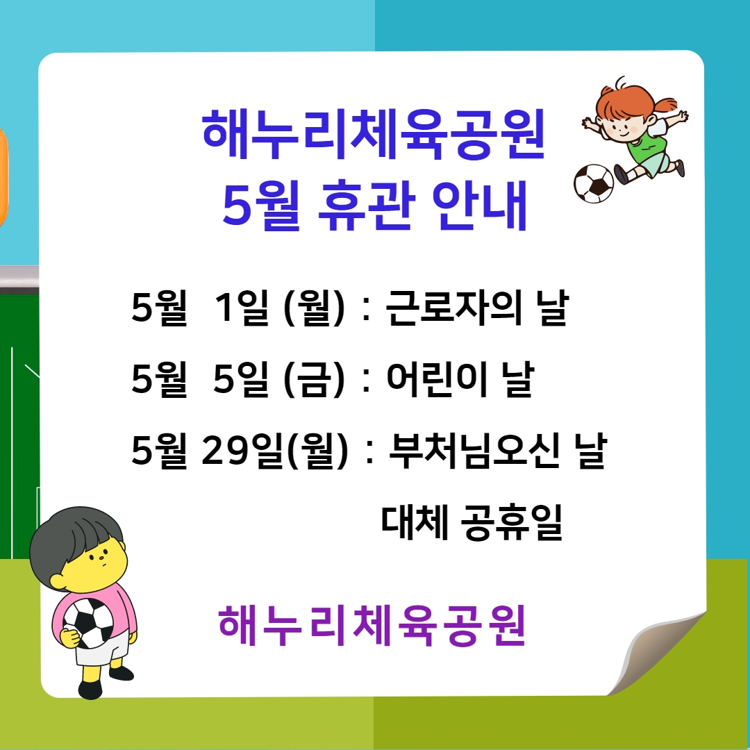 해누리체육공원 5월 휴관일 안내 작성자 이상진 등록일자 2023년 4월 24일 16시 35분 5초 조회 447 5월 휴관안내.jpg [ Size : 228.24KB , Down : 385 ] 미리보기 다운로드 목록보기