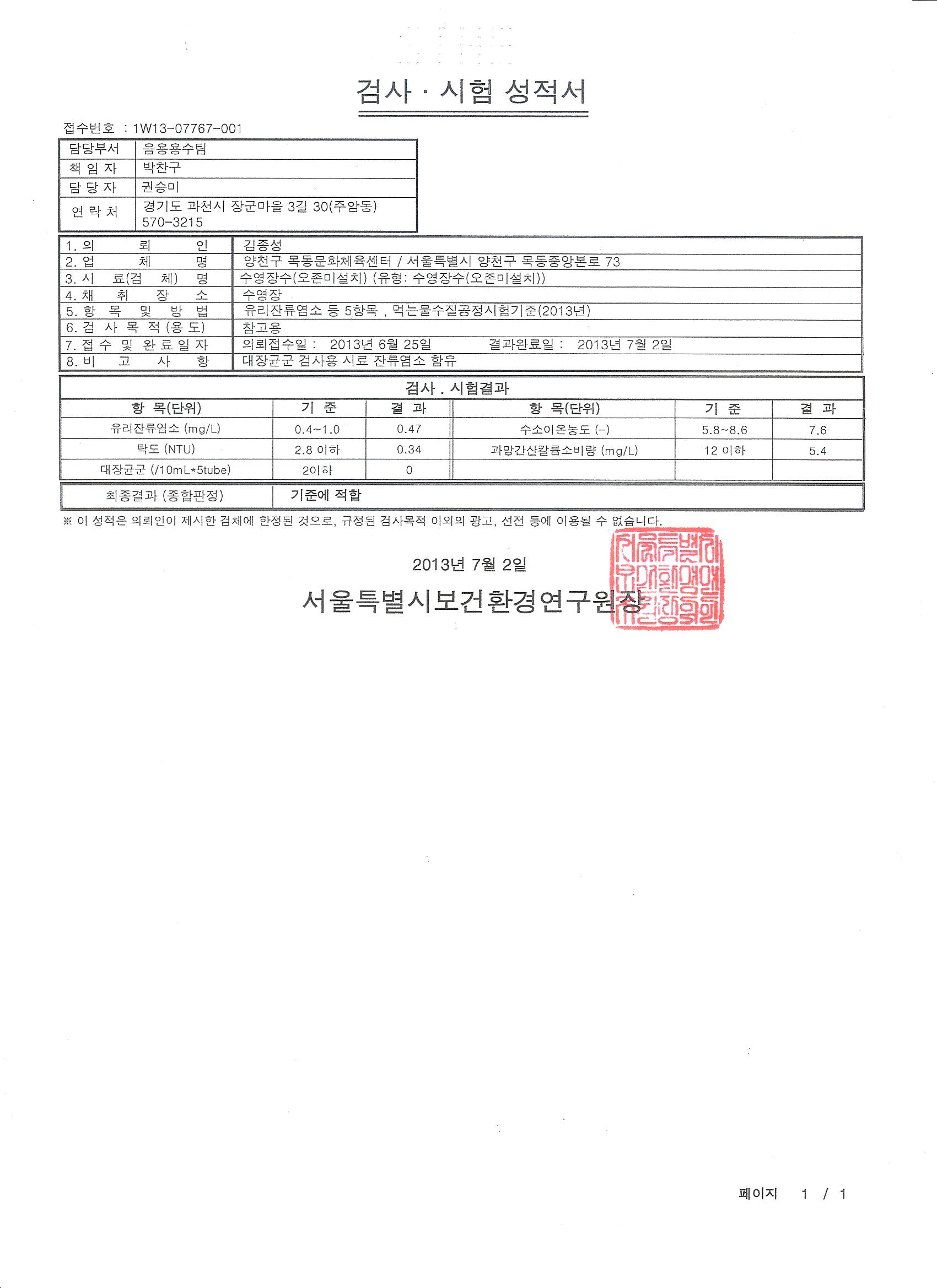 목동문화체육센터 수영장 수질검사 결과를 아래와 같이 공지합니다.