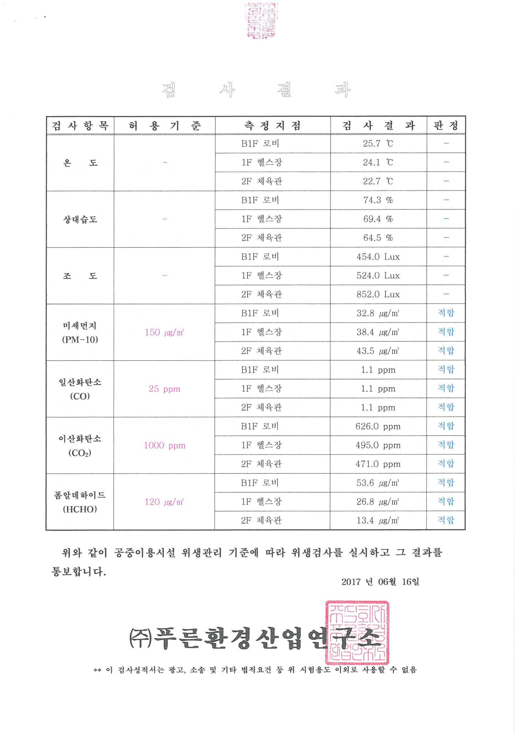 목동센터 실내공기질 검사결과 공지 작성자 등록일자 2017년 6월 23일 11시 25분 37초 조회 1,042 목동문화체육센터 실내공기질 검사결과를 아래와 같이 공지합니다.검사일자 : 2017.06.07검사항목 : 미세먼지, 일산화탄소, 이산화탄소, 폼알데하이드검사결과 : 적합 싫내공기질 검사결과.jpg [ Size : 258.6KB , Down : 108 ] 미리보기 다운로드 목록보기