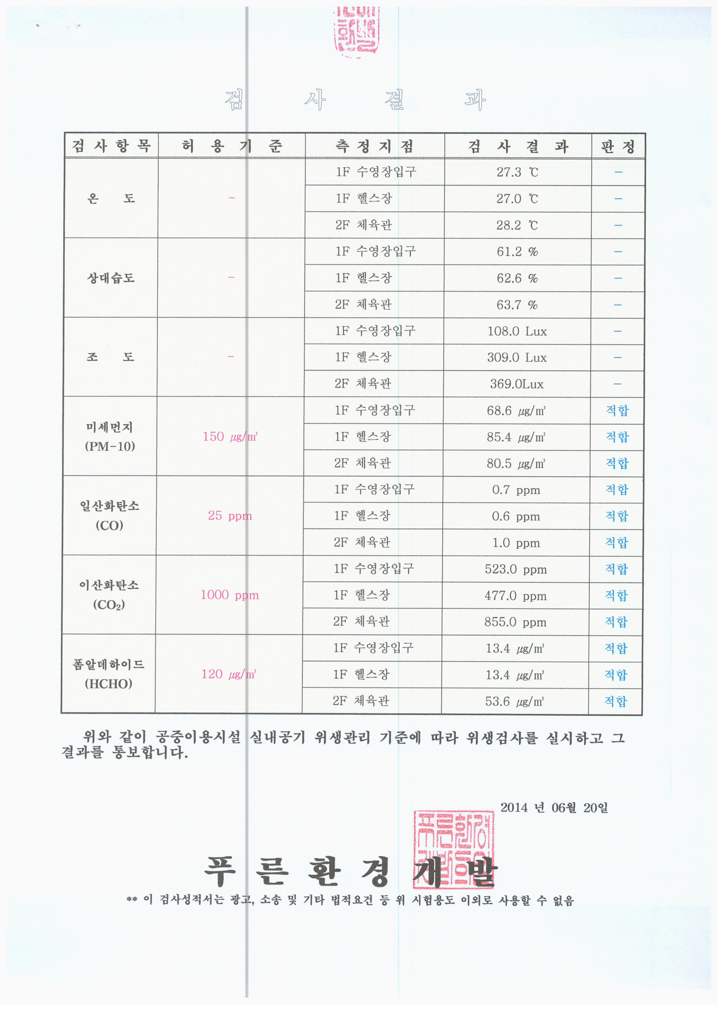 <P>목동문화체육센터 실내공기질 검사결과를 아래와 같이 공지합니다.</P> <P>검사일자 : 2014.06.13</P> <P>검사항목 : 미세먼지, 일산화탄소, 이산화탄소, 폼알데하이드</P> <P>검사결과 : 적합 </P><!-- 포토 겔러리 때문에 if문 추가 함. 첨부파일형태로 나오지 않게 하기 위해.. -->