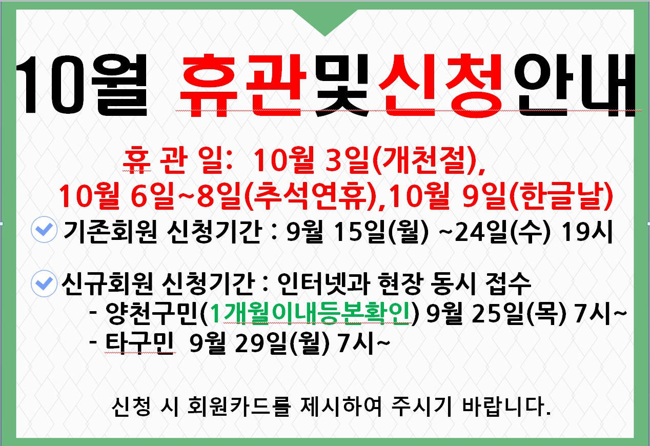 양천구민체육센터 10월 휴관일 및 신청일 안내 작성자 임명희 등록일자 2025년 9월 9일 11시 27분 32초 조회 955 10월 등록안내.jpg [ Size : 578.71KB , Down : 1,333 ] 미리보기 다운로드 목록보기