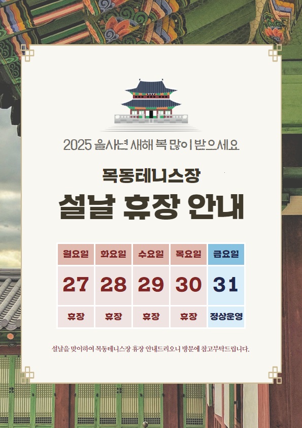 목동테니스장 설 연휴 휴장 안내 작성자 윤성철 등록일자 2025년 1월 17일 9시 43분 16초 조회 337 휴장안내(2025 설 연휴).jpg [ Size : 137.87KB , Down : 375 ] 미리보기 다운로드 목록보기