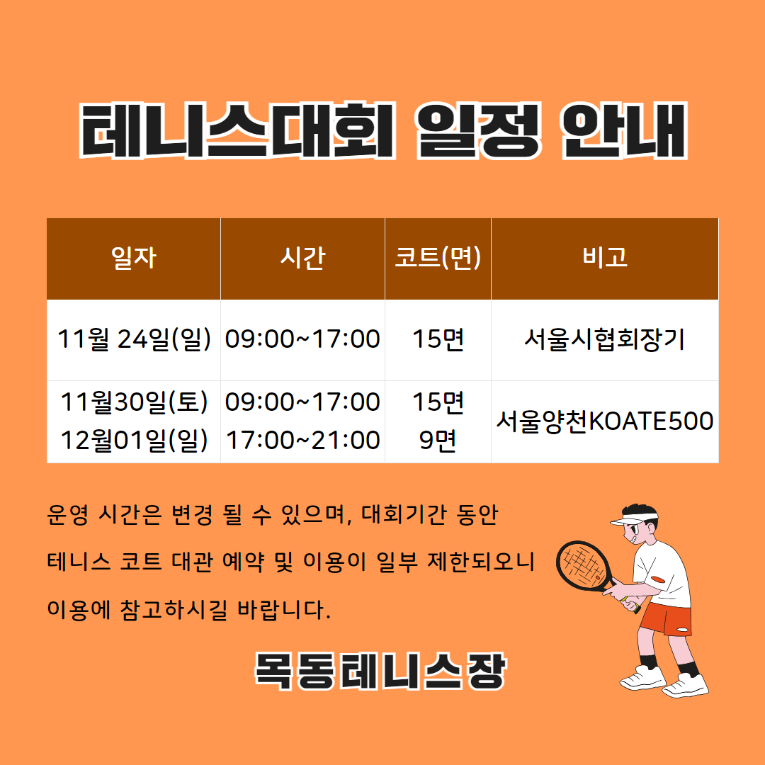 목동테니스장 11월 대회 일정 안내(시간변경) 작성자 윤성철 등록일자 2024년 11월 12일 17시 36분 53초 조회 217 대회일정안내.jpg [ Size : 432.35KB , Down : 194 ] 미리보기 다운로드 목록보기
