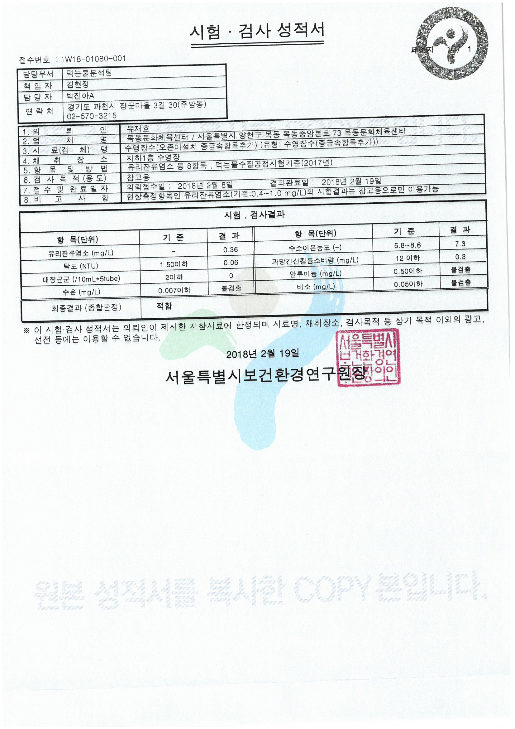 목동문화체육센터 수영장 수질에 대한 전문기관 검사 결과를 아래와 같이 공지합니다.