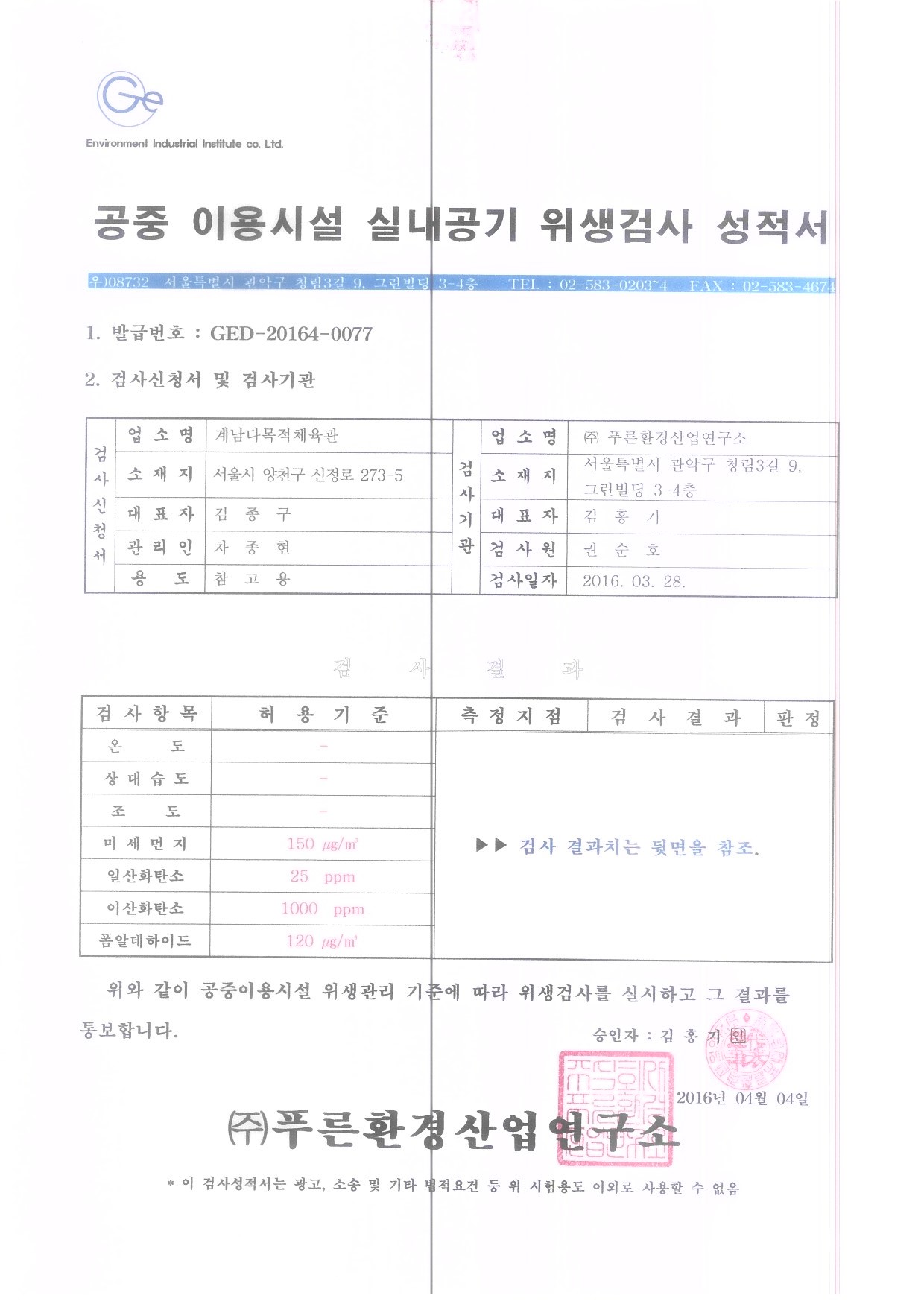 계남다목적체육관 2016년 1분기 실내공기질검사 결과 공지
