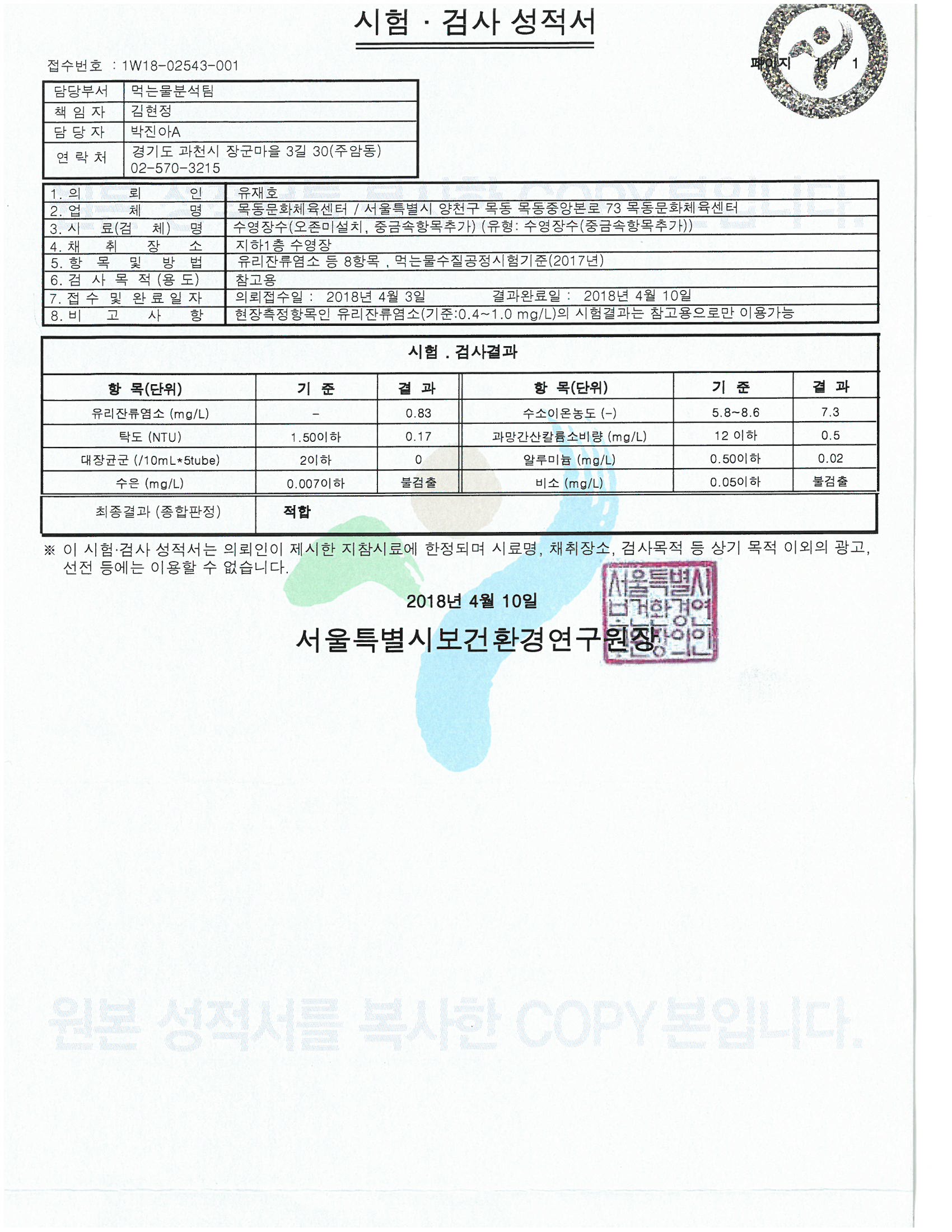 목동문화체육센터 수영장 수질에 대한 전문기관 검사 결과를 아래와 같이 공지합니다.