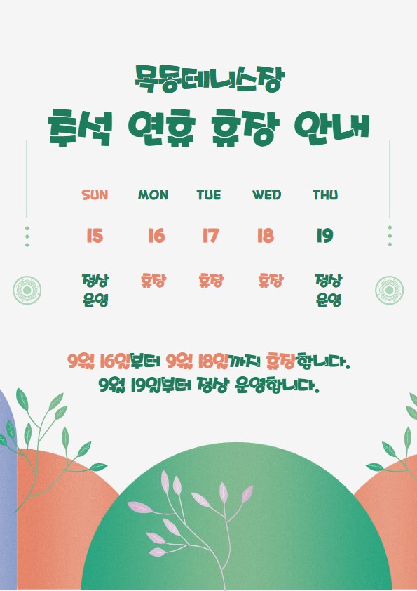 목동테니스장 추석 연휴 휴장 안내 작성자 윤성철 등록일자 2024년 9월 6일 8시 36분 51초 조회 392 추석 연휴 휴장 안내.jpg [ Size : 73.53KB , Down : 441 ] 미리보기 다운로드 목록보기