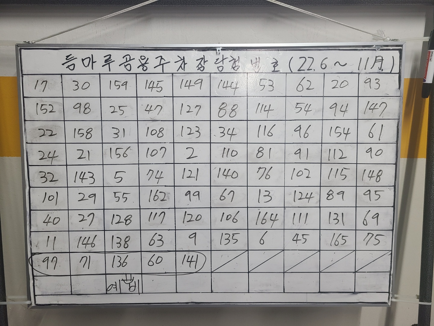 등마루 공영주차장 정기권 추첨 결과 작성자 등록일자 2022년 5월 26일 13시 56분 34초 조회 472 정기권 추첨 결과를 공지하오니 당첨되신 분들께서는 아래 기한까지 접수해 주시기 바랍니다.■ 접수기간 : 2022. 05. 25.(수) 08시 ~ 05. 31.(화) 17시까지 (토,일요일 제외)■ 접수장소 : 등마루 공영주차장 관리사무실 등마루공영주차장 정기권 추첨 결과.jpg [ Size : 504.27KB , Down : 158 ] 미리보기 다운로드 목록보기