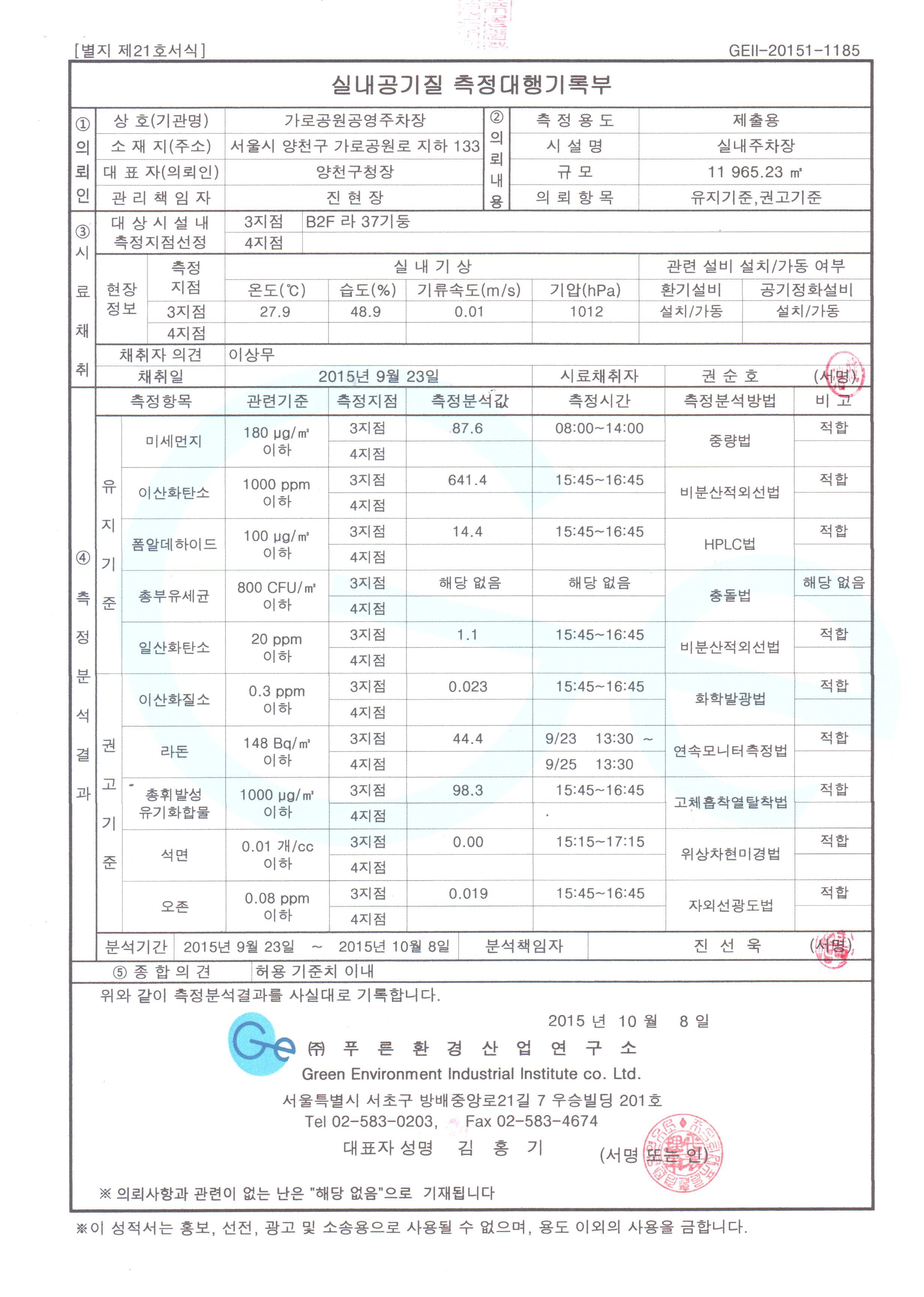 <P>가로공원 주차장 실내공기질 측정 결과를 붙임과 같이 공지합니다.</P> <P> </P> <P>상 호 : 가로공원공영주차장</P> <P>시 설 명 : 실내주차장</P> <P>분석결과 : 적합</P> <P> </P>