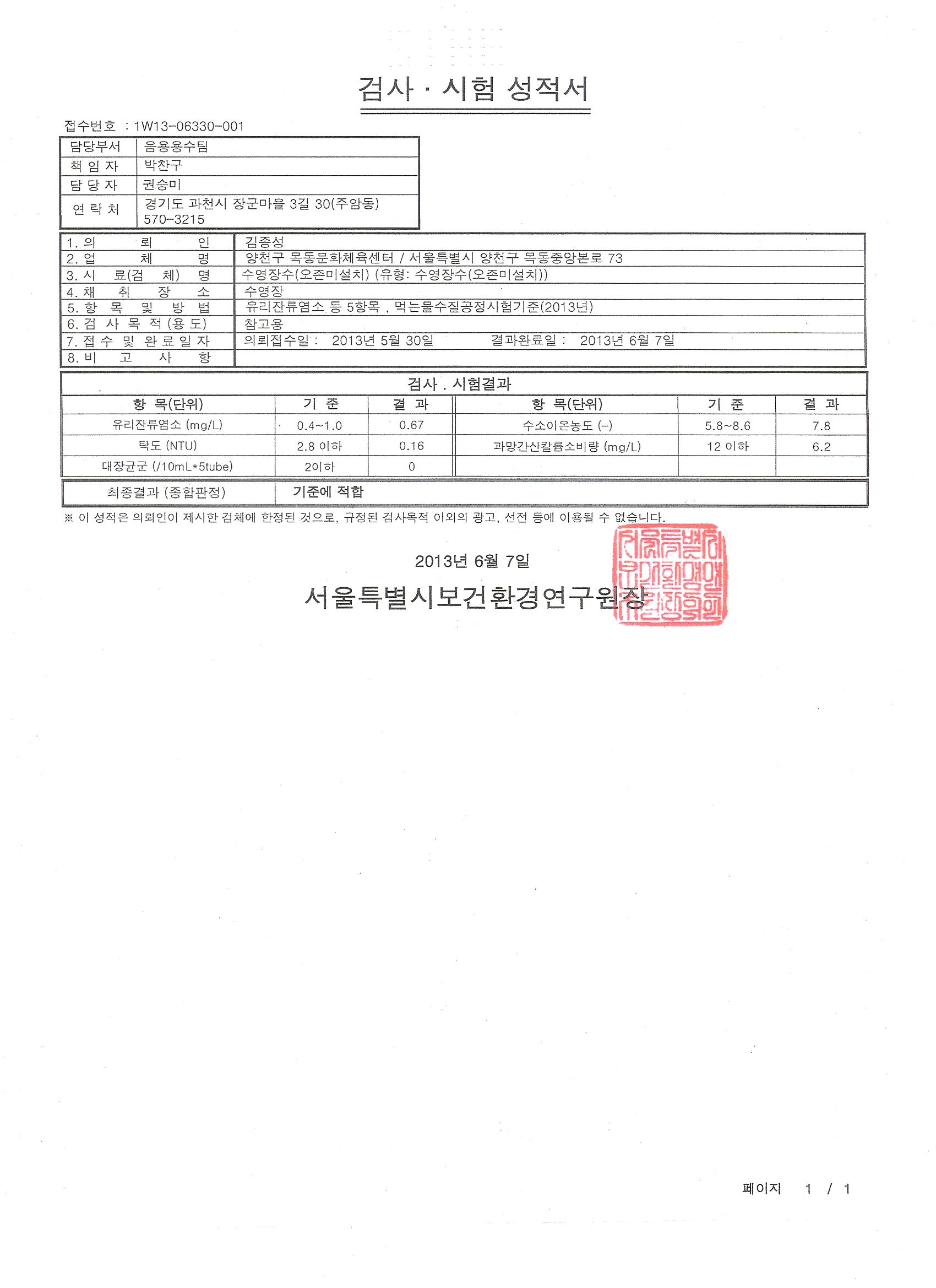 목동문화체육센터 수질검사 결과를 아래와 같이 공지합니다.