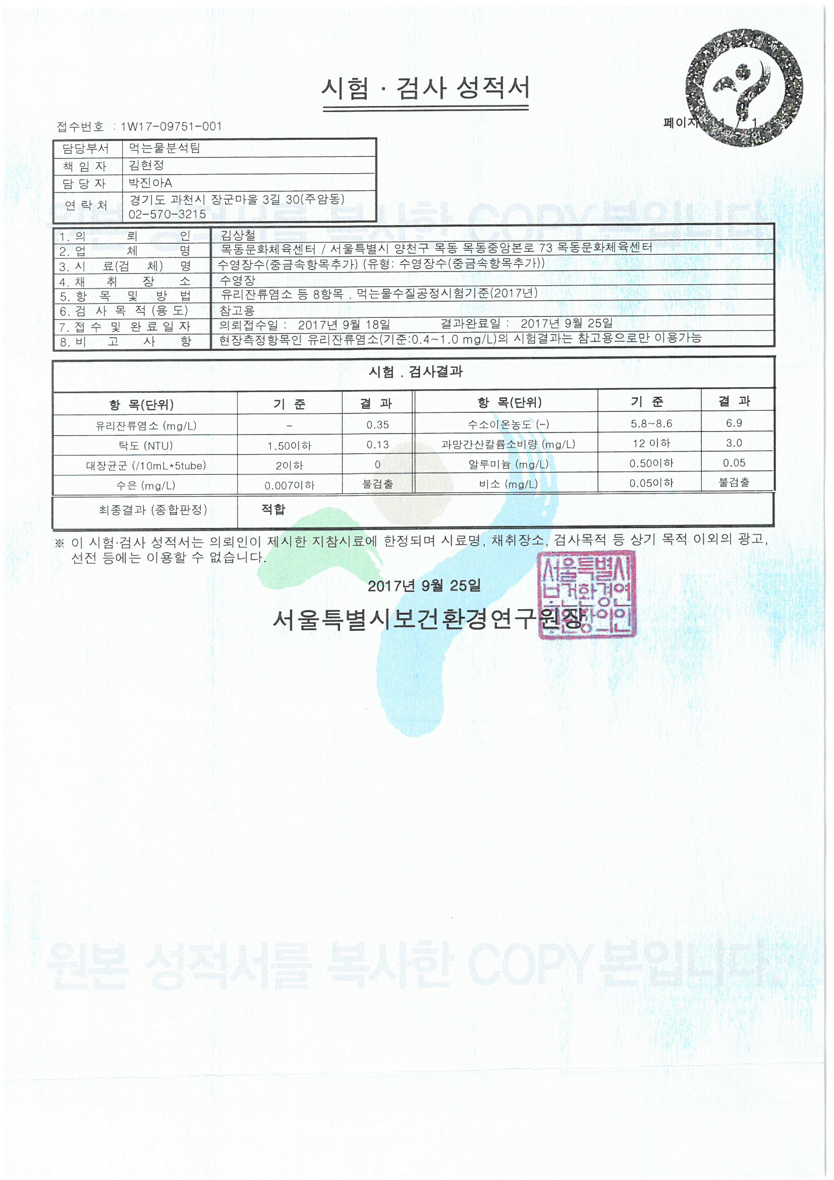 목동문화체육센터 수영장 욕수 수질검사 결과 안내