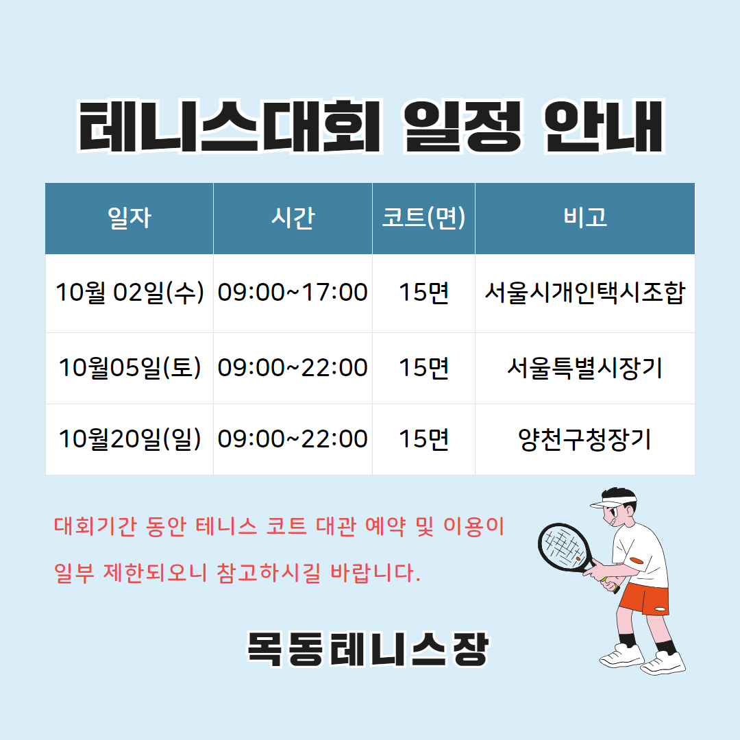 목동테니스장 10월 대회 일정 안내 작성자 윤성철 등록일자 2024년 9월 25일 8시 52분 30초 조회 286 대회일정안내(2024.10.).jpg [ Size : 395.01KB , Down : 436 ] 미리보기 다운로드 목록보기