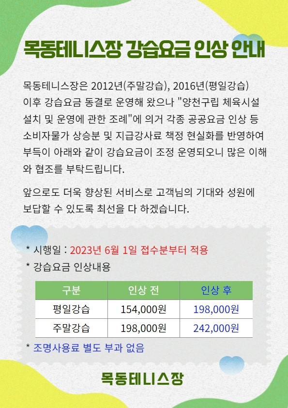 목동테니스장 강습요금 인상 안내 작성자 윤성철 등록일자 2023년 5월 10일 9시 37분 2초 조회 764 요금인상.jpg [ Size : 179.21KB , Down : 807 ] 미리보기 다운로드 목록보기